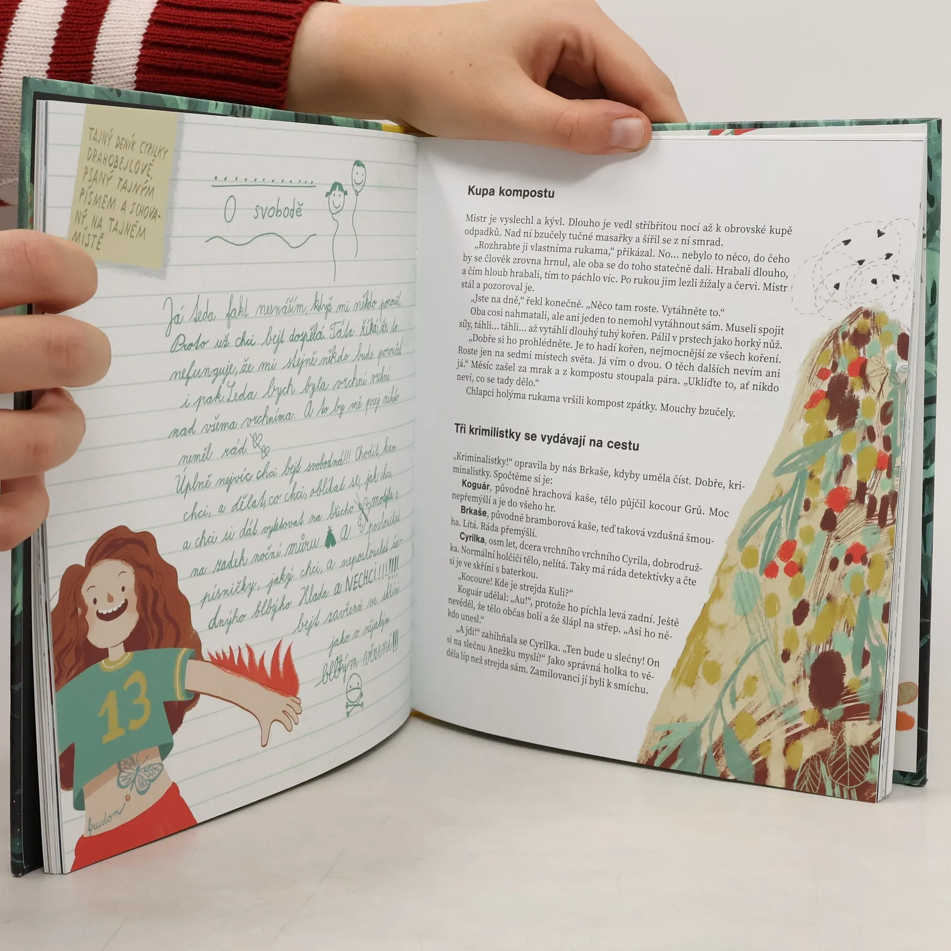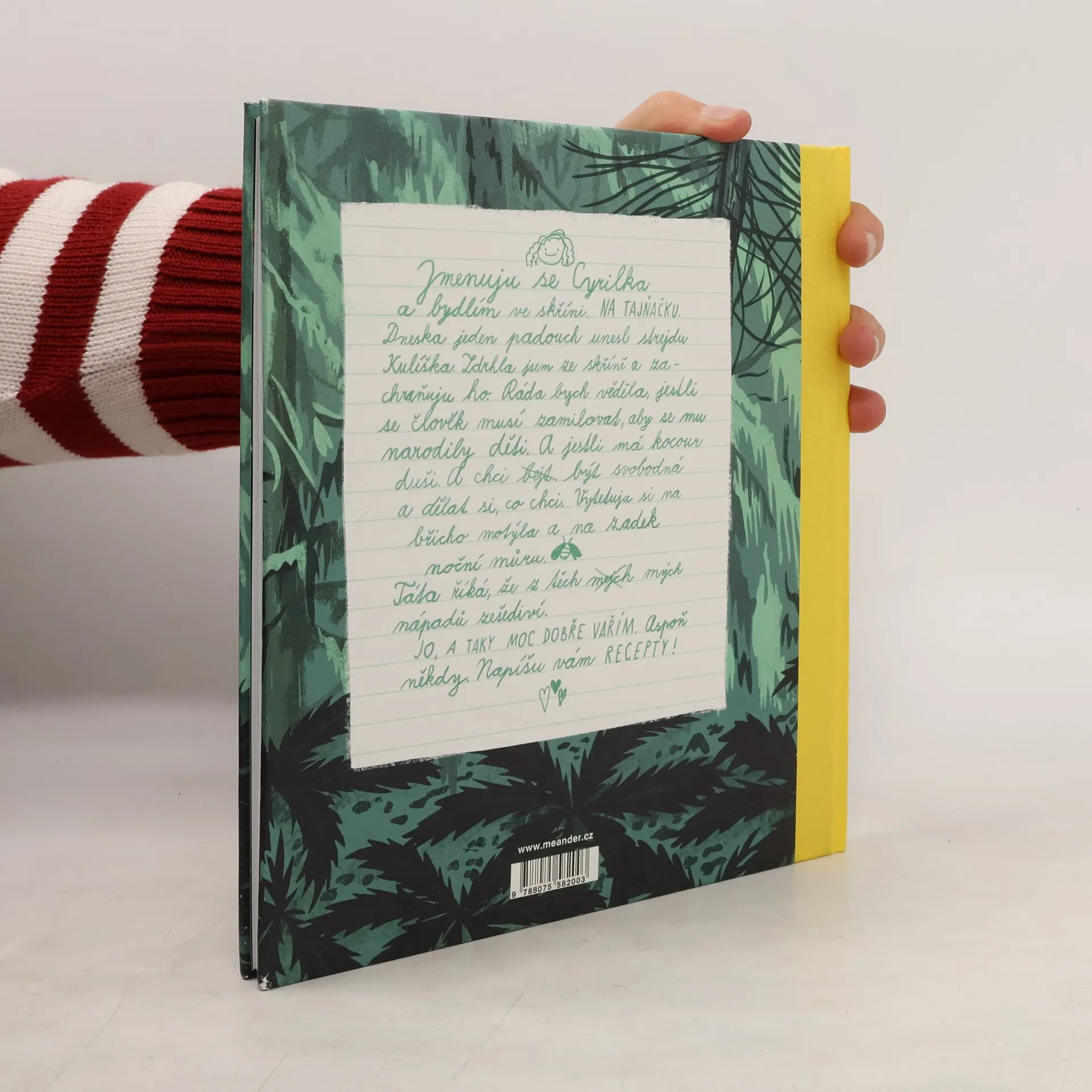 Dneska jeden padouch unesl strejdu Kulíška. Zdrhla jsem ze skříně a zachraňuju ho. Ráda bych věděla, jestli se člověk musí zamilovat, aby se mu narodily děti. A jestli má kocour duši. A chci bejt být svobodná a dělat si, co chci. Vytetuju si na břicho motýla a na zadek noční můru. Táta říká, že z těch mejch mých nápadů zešediví. Jo, a taky moc dobře vařím. Aspoň někdy. Napíšu vám recepty!