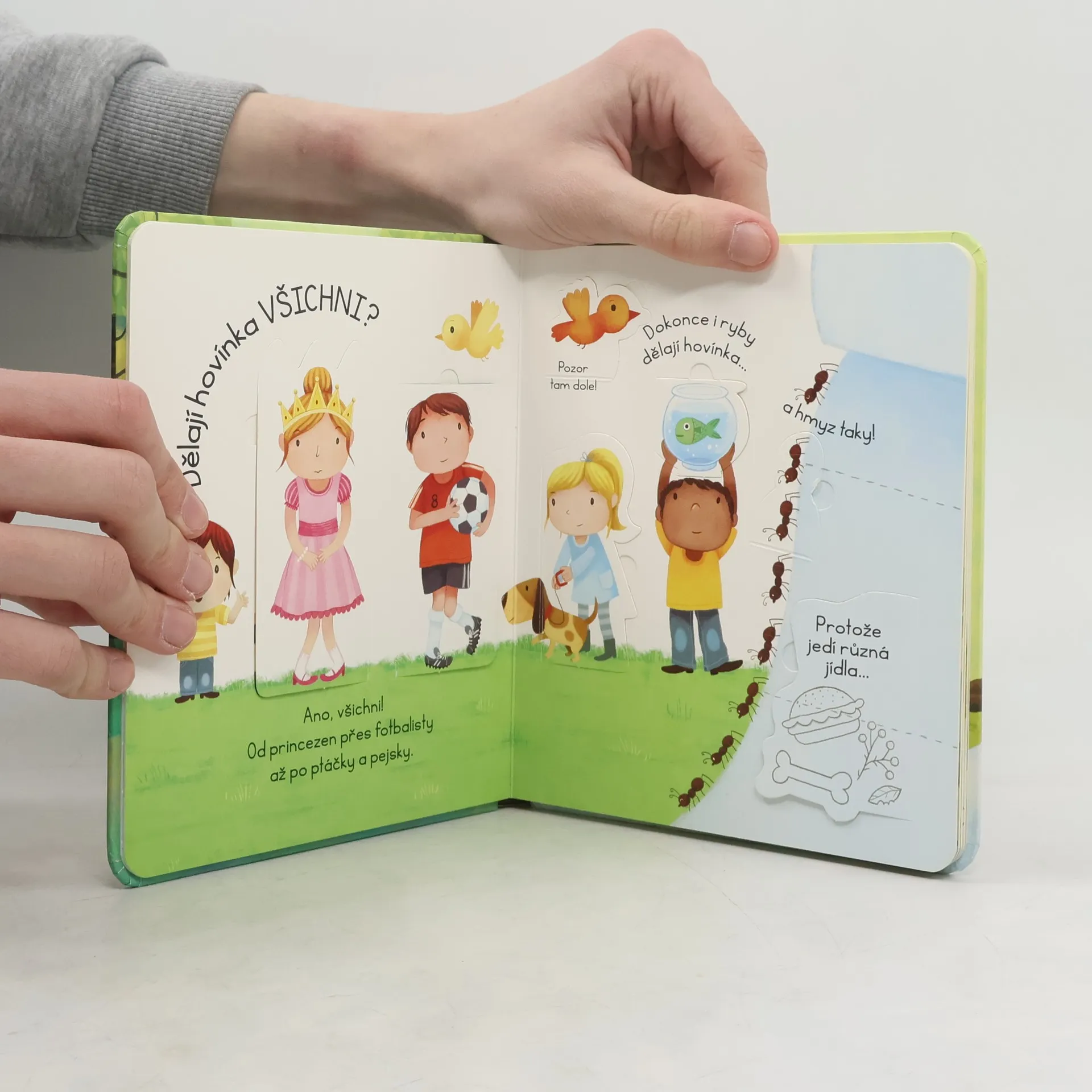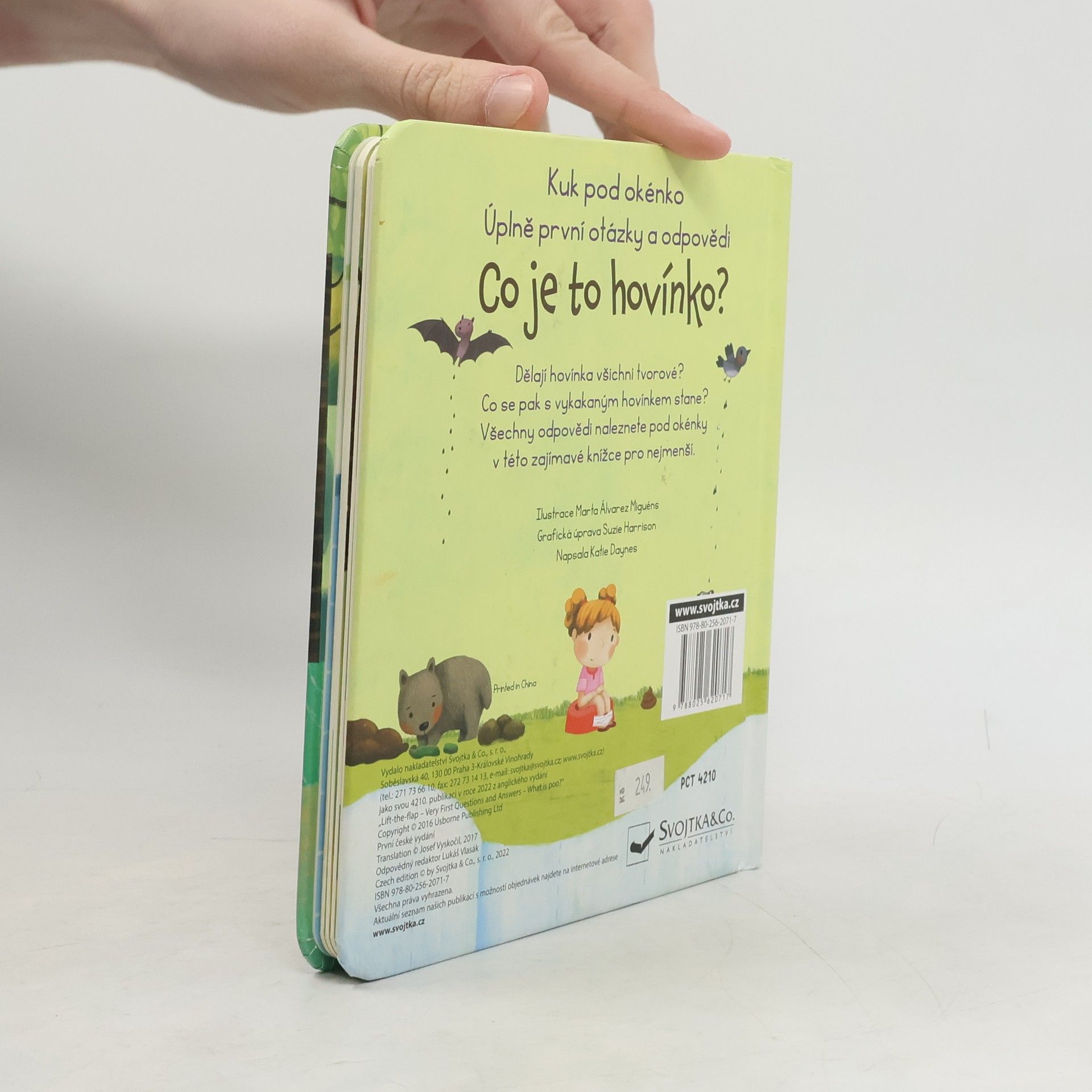 Kakají všichni. Ale co se pak s vykakaným hovínkem stane? Odpovědi naleznete pod okénky v této knížce pro nejmenší. Hovínko se dělá do plíny, splachuje se do záchoda, zvířátka dělají svá hovínka venku... Ale co to vlastně hovínko je? Víš, že jsou brouci, kteří si dělají z hovínek kuličky, a že králík svoje bobky dokonce jí? Na všechny všetečné otázky dětí na téma "Co je to hovínko?" najdou bezradní rodiče odpovědi v této úžasné knížce s odklápěcími okénky.