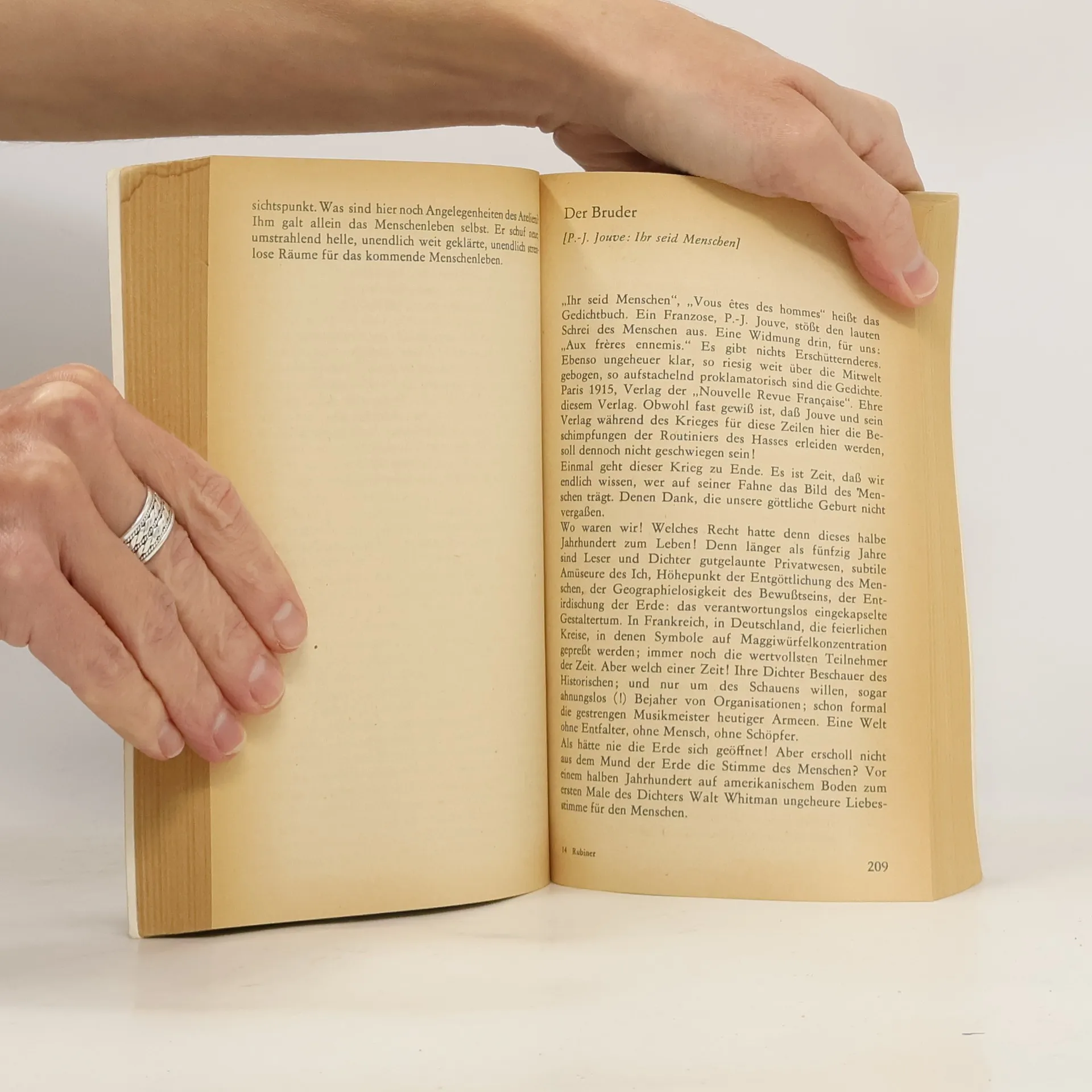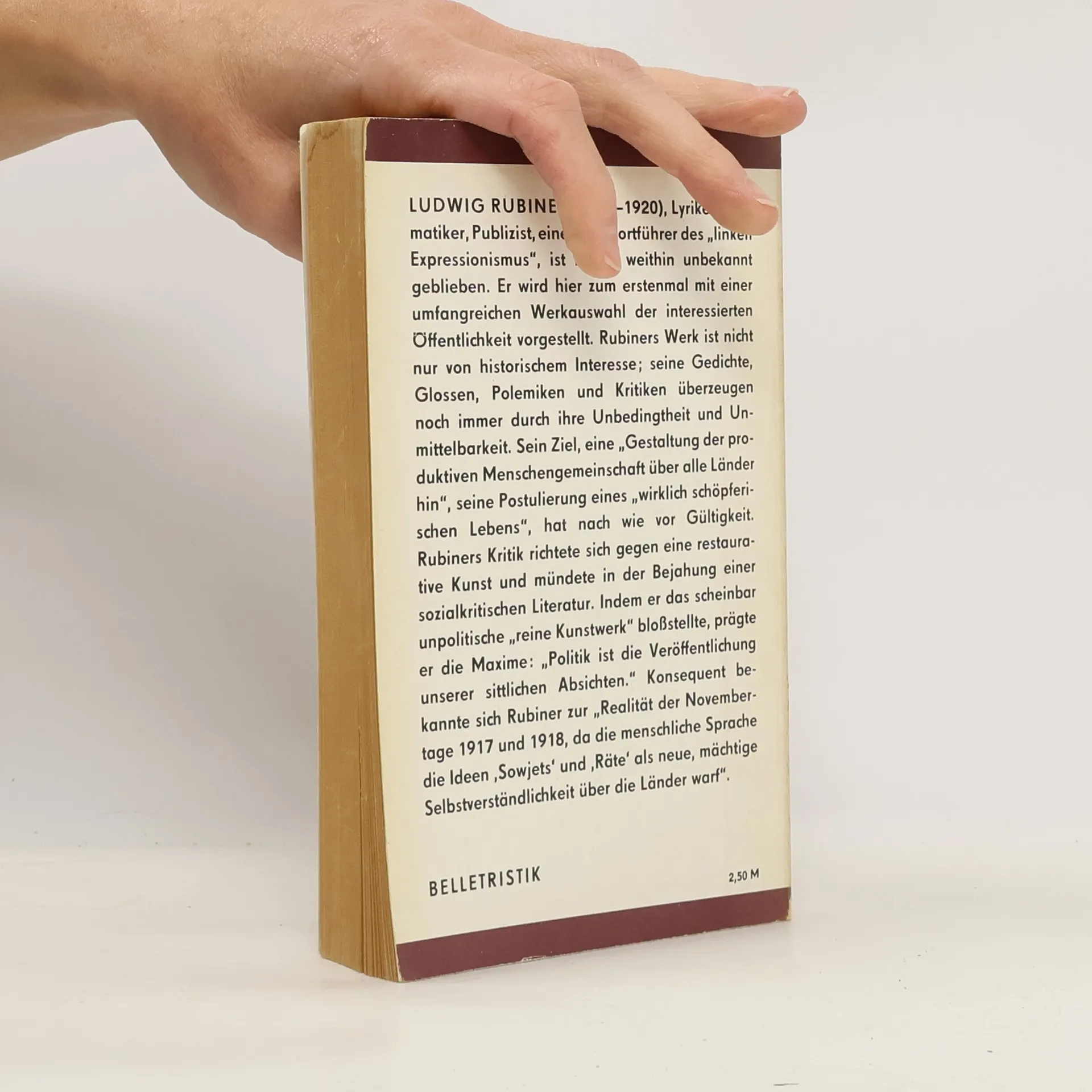 Ludwig Rubiner (1881-1920), Lyriker, Dramatiker, Publizist, einer der Wortführer des "linken Expressionismus", ist bisher weithin unbekannt geblieben. Er wird hier zum erstenmal mit einer umfangreichen Werkauswahl der interessierten Öffentlichkeit vorgestellt. Rubiners Werk ist nicht nur von historischem Interesse; seine Gedichte, Glossen, Polemiken und Kritiken überzeugen noch immer durch ihre Unbedingtheit und Unmittelbarkeit. Sein Ziel, eine "Gestaltung der produktiven Menschengemeinschaft über alle Länder hin", seine Postulierung eines "wirklich schöpferischen Lebens", hat nach wie vor Gültigkeit. Rubiners Kritik richtete sich gegen eine restaurative Kunst und mündete in der Bejahung einer sozialkritischen Literatur. Indem er das scheinbar unpolitische "reine Kunstwerk" bloßstellte, prägte er die Maxime: "Politik ist die Veröffentlichung unserer sittlichen Absichten." Konsequent bekannte sich Rubiner zur "Realität der Novembertage 1917 und 1918, da die menschliche Sprache die Ideen 'Sowjets' und 'Räte' als neue, mächtige Selbstverständlichkeit über die Länder warf".