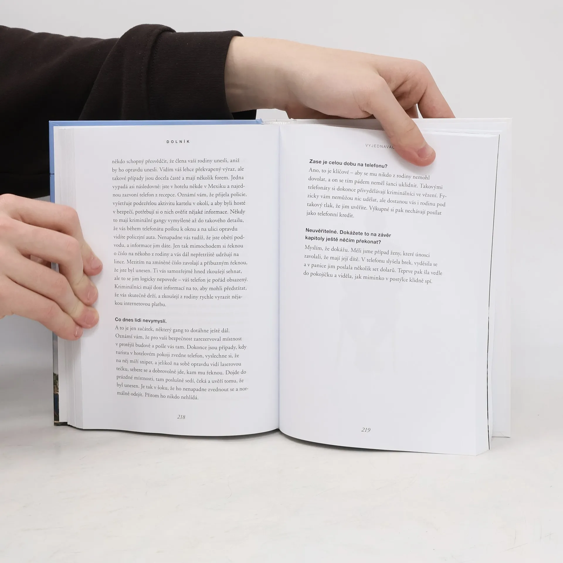 Vítejte v nejtemnějších zákoutích zločinu. Na místech, kde se unáší, vyhrožuje a požaduje výkupné. Provede vás jimi Adam Dolník, který jako jeden z mála lidí na světě vyjednává s únosci, vyděrači, piráty i teroristy. Ze zajetí už dostal desítky rukojmích a při jeho vyprávění mrazí. O vyjednavačích se toho moc neví. A málokdo tuší, že mezi těmi nejlepšími je i Čech. Když mu zazvoní telefon, má jen pár minut na to, aby se sbalil a odletěl do Nigérie, Pákistánu, na Haiti… Jak se k takové práci dostal? Co všechno při ní zažil? Spoustu emocí, napětí a dramatických příběhů. Během kariéry školil agenty FBI i Scotland Yardu. Potýkal se s kriminálními gangy, somálskými piráty, ale třeba i s Islámským státem. Nejednou se ocitl mezi teroristy a v situacích, kdy mu hrozilo, že se sám nevrátí domů. Kde se unáší nejvíc? Jak se vyjednává o lidský život? A jak to lze tyto dovednosti využít v každodenních situacích?