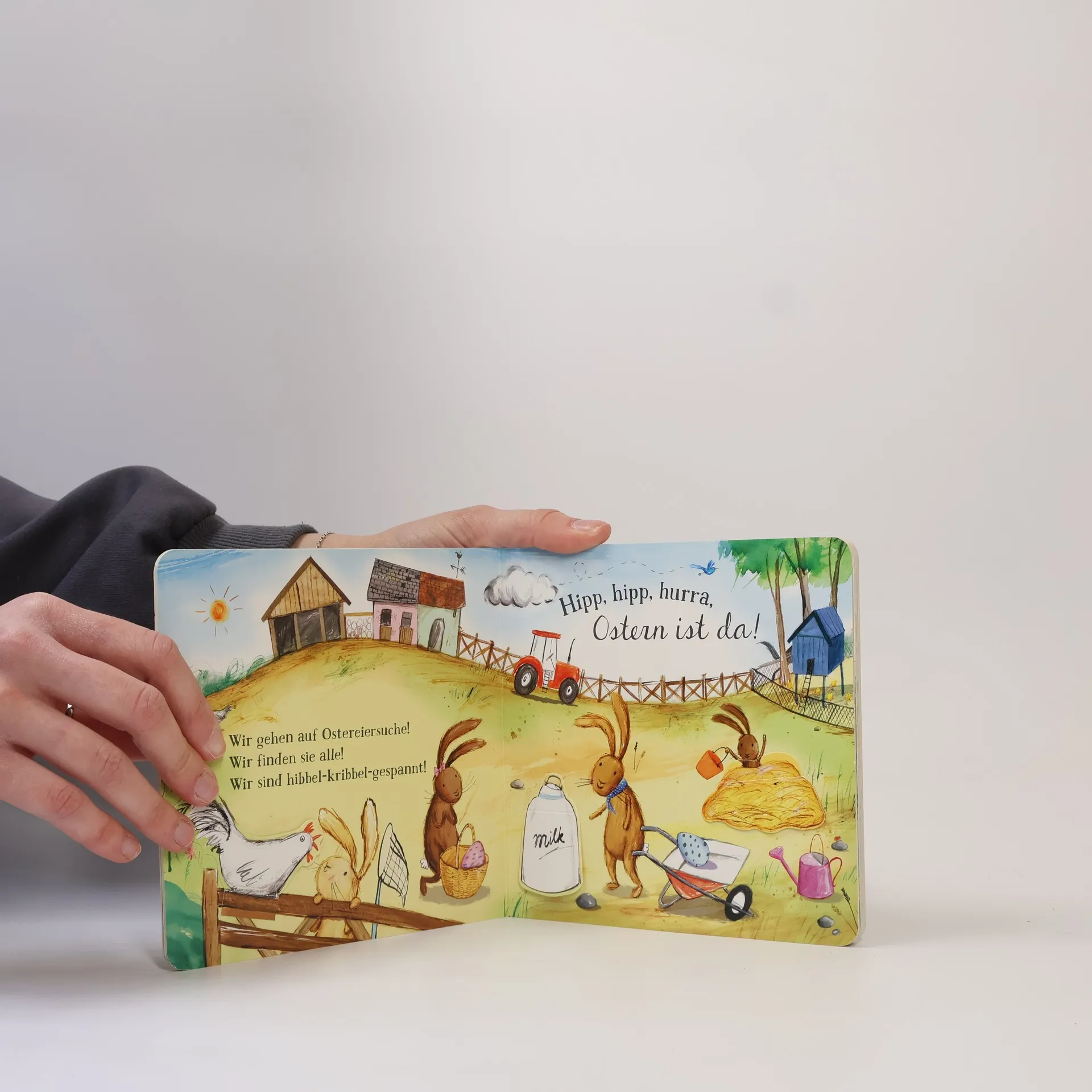 „Hurra, es ist Ostern!“ ist ein interaktives Pappbilderbuch, das Kinder auf die Suche nach versteckten Ostereiern einlädt. Mit stabilen Klappen, die Überraschungen bergen, fördert es spielerisch die Motorik. Liebevolle Illustrationen und ein handliches Format machen es ideal für kleine Kinderhände.