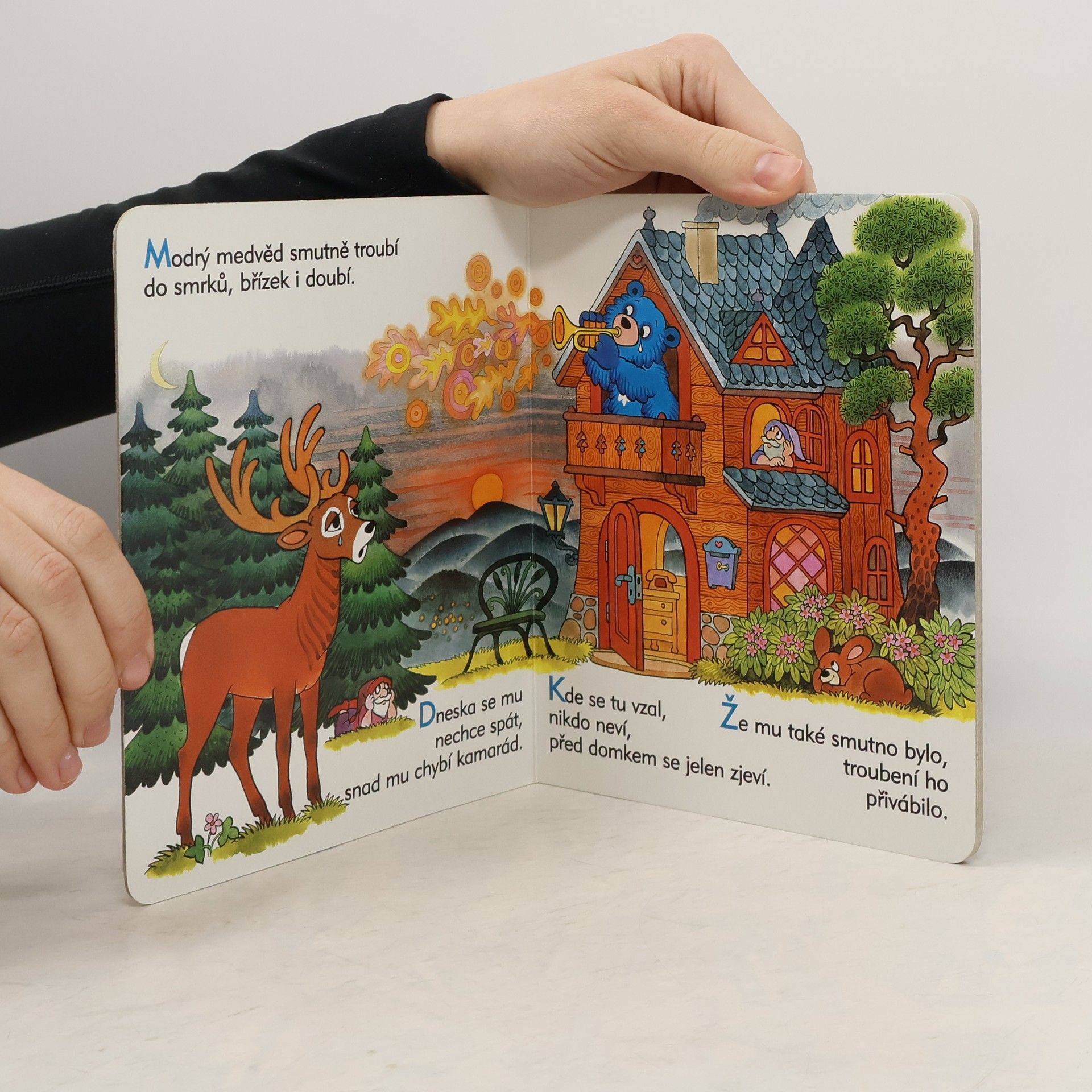 Modrému medvědovi je smutno, protože mu chybí kamarád. I jelen je smutný, ale malá víla je dokáže oba rozveselit. Další příhoda Modrého medvěda a jeho lesních přátel. Leporelo pro děti od dvou let.