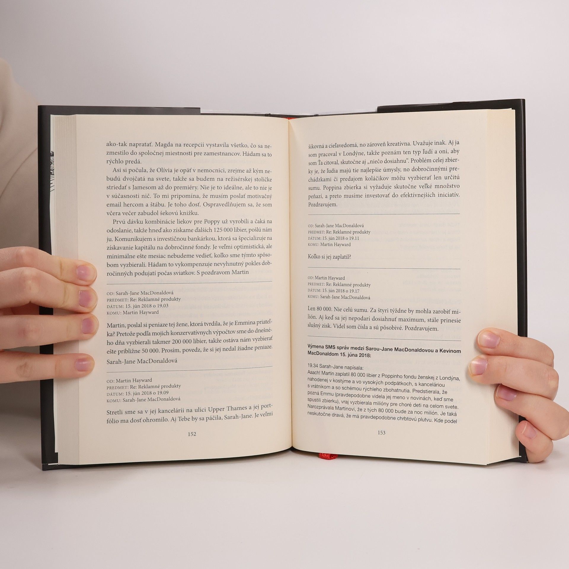 Hlavní aktéri miestneho divadelného združenia sa dozvedia zdrvujúcu správu. Ich vnučka má rakovinu. Členovia divadelného spolku zorganizujú finančnú zbierku, no vzápätí sa vynárajú pochybnosti o dobrom úmysle niektorých z jej organizátorov. Spor vyvrcholí vraždou, podozrivý je zatknutý a čaká na súd. Autorka poskytuje čitateľovi možnosť zapojiť sa do práce dvojice právnikov a pomocou e-mailov a správ, ktoré sú hlavným nosičom deja, odhaliť, kto je skutočným vrahom.