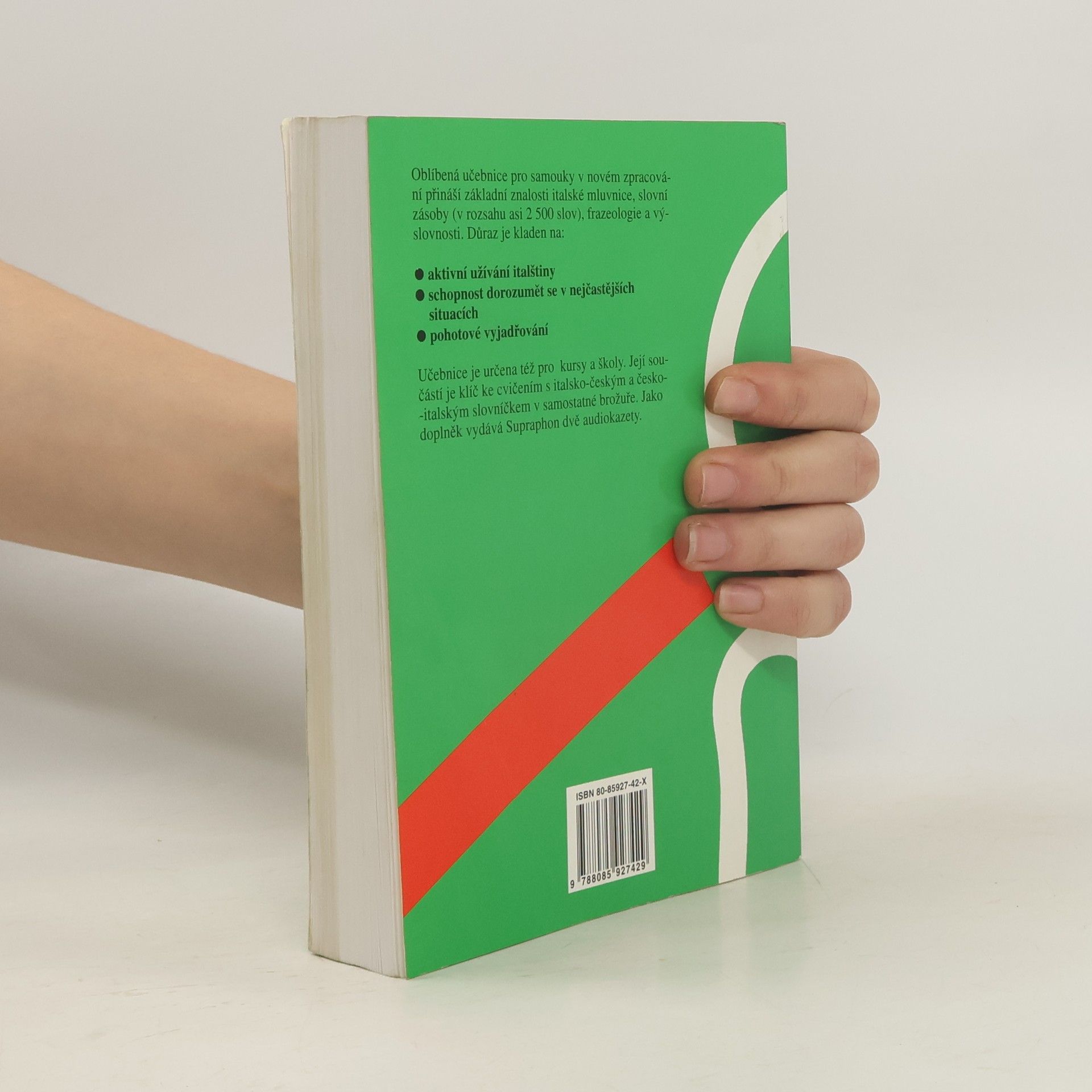 Oblíbená učebnice pro samouky v novém zpracování přináší základní znalosti italské mluvnice, slovní zásoby (v rozsahu asi 2500 slov ), frazeologie a výslovnosti. Důraz je kladen na: aktivní užívání italštiny schopnost dorozumět se v nejčastějších situacích pohotové vyjádřováníUčebnice je určena též pro školy a kursy. Její součásti je brožura obsahující klíč ke cvičením s italsko-českým a česko-italským slovníčkem. Jako samostatný doplněk vydává Supraphon audionahrávku.