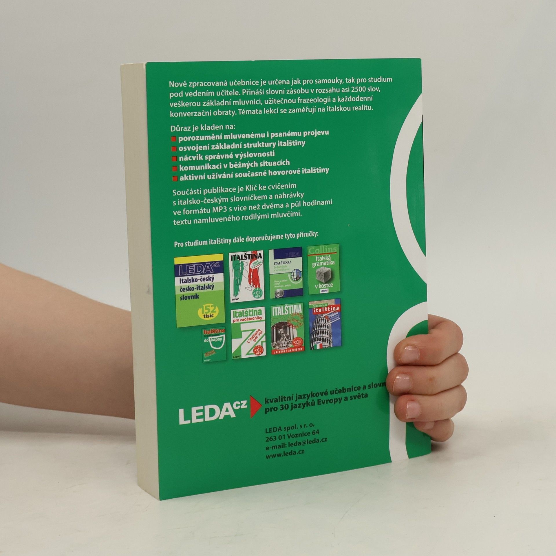 Nově zpracované vydání oblíbené učebnice pro samouky obsahuje italskou mluvnici, slovní­ zásobu v rozsahu asi 2500 slov, frazeologii a výslovnost. Důraz je kladen na aktivní­ užívání­ italštiny, schopnost dorozumět se a pohotově reagovat v nejčastější­ch situacích. Každou lekci uzavírají­ kvizy, které mají vzbudit zájem uživatele o kulturu Itálie. Učebnice je určena také pro kursy a školy. Její součástí je klíč ke cvičení­m s italsko-českým a česko-italským slovníčkem v samostatné brožuře a nahrávka vybraných textů na dvou audio CD.
