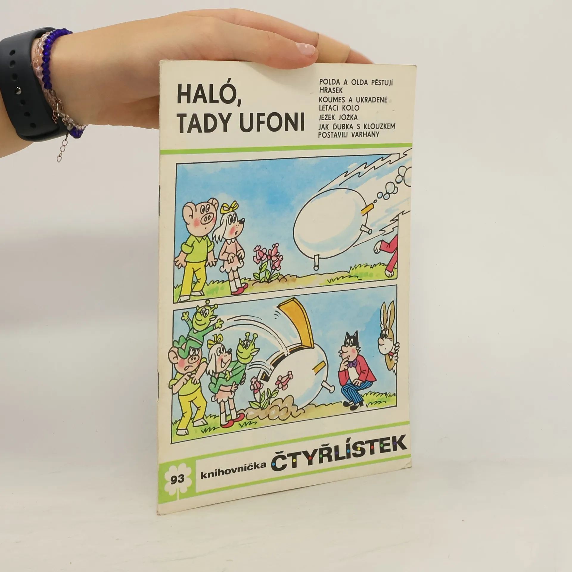 93. díl oblíbené série. Příběh Čtyřlístku Haló, tady ufoni - Ljuba Štíplová, Jaroslav Němeček. Dále Polda a Olda pěstují hrášek - Petr Chvojka, Jaroslav Malák, Koumes a ukradené létací kolo - Vladimír Kliman, Sylvie Vodáková . Ježek Jožka - Ladislav Čapek a Jak Ďubka s Klouzkem postavili varhany - Jaroslav Cita.