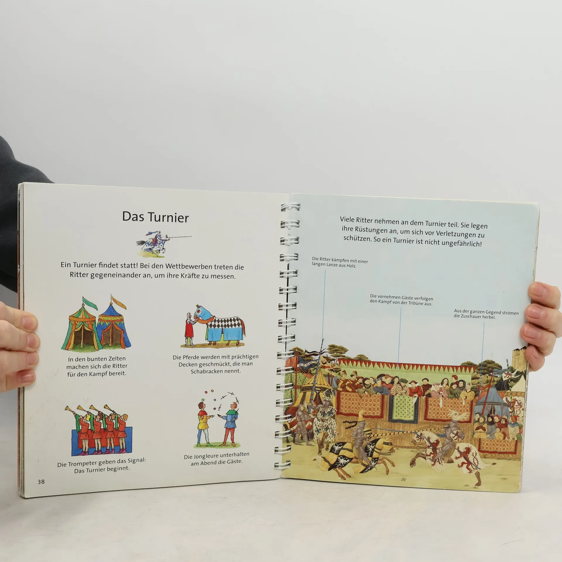 Ein spannendes Ritterbuch mit bunten Folien, das das Leben auf einer mittelalterlichen Burg lebendig werden lässt. Köche bereiten Festmahl zu, während Ritter für ein Turnier trainieren. Die Folienseiten enthüllen verborgene Details und bieten aufregende Entdeckungsmöglichkeiten.
