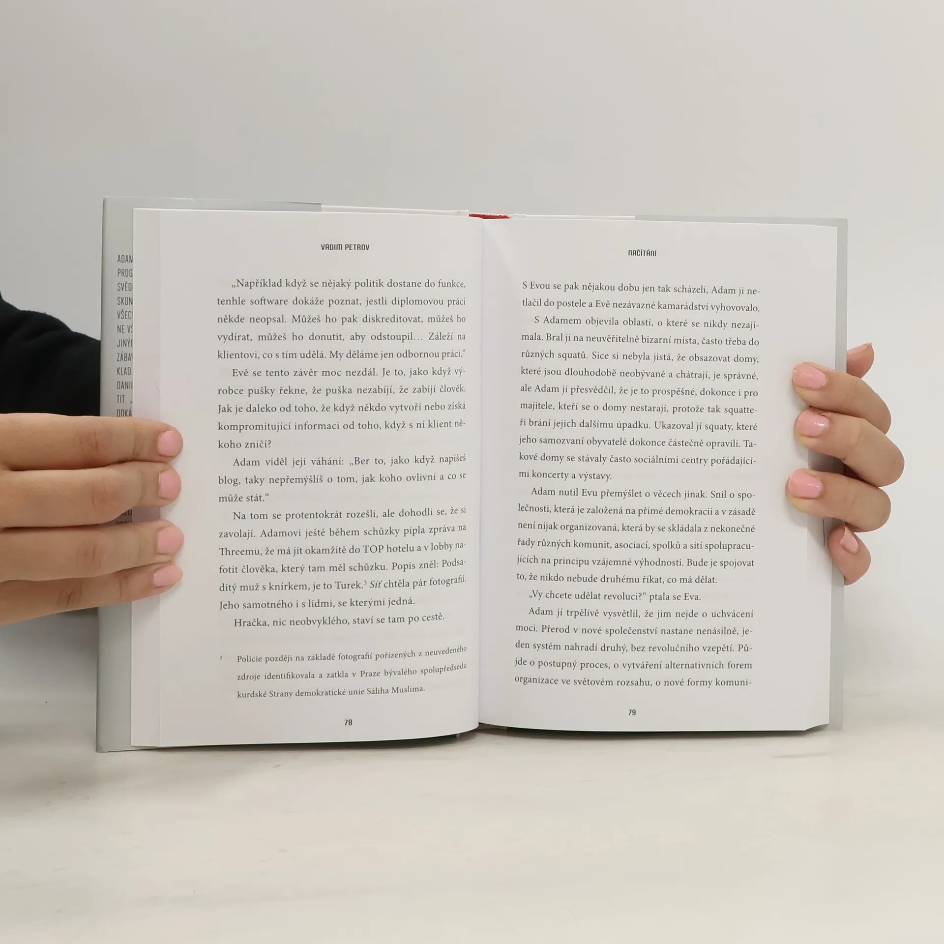 Román Vadima Petrova na aktuální téma virtuálních životů, kyberterorismu a fake news. Adam je představitel internetové generace. Také je programátor, počítačový hacker a aktivista. Je přesvědčený, že dosavadní společenská pravidla musí skončit a nahradí je jiná. Internet a volný přístup všech a ke všemu k tomu dává jedinečnou příležitost. Ne všechny z jeho generace to trápí, život nabízí tolik jiných povyražení než měnit svět, ale je to jedna ze zábavných možností. Adamova přítelkyně Eva má například o životě zcela jinou představu. Daniel je čerstvý důchodce. Snaží se ještě nějak chytit. Jenže pracovní trh potřebuje mladé lidi, kteří dokážou přepínat mezi reálným a virtuálním světem automaticky, bez přemýšlení. Navíc Daniel cítí, jak mu ubývá energie. Dost sil ho stojí, aby se přicházejícímu stáří ubránil a přirozený úpadek organismu zpomalil. Jeho o dost mladší partnerka Clare věnovala veškerý čas kariéře a životnímu stylu bez dětí. Velkou rodinu ale vždycky chtěla. Má poslední příležitost něco s tím udělat. Posledním z hlavních hrdinů je Wang. Životní tragédie mu změnila pohled na svět. Stal se vnímavější. Ti všichni mají silnou touhu po životní změně. Jen potřebují impulz.
