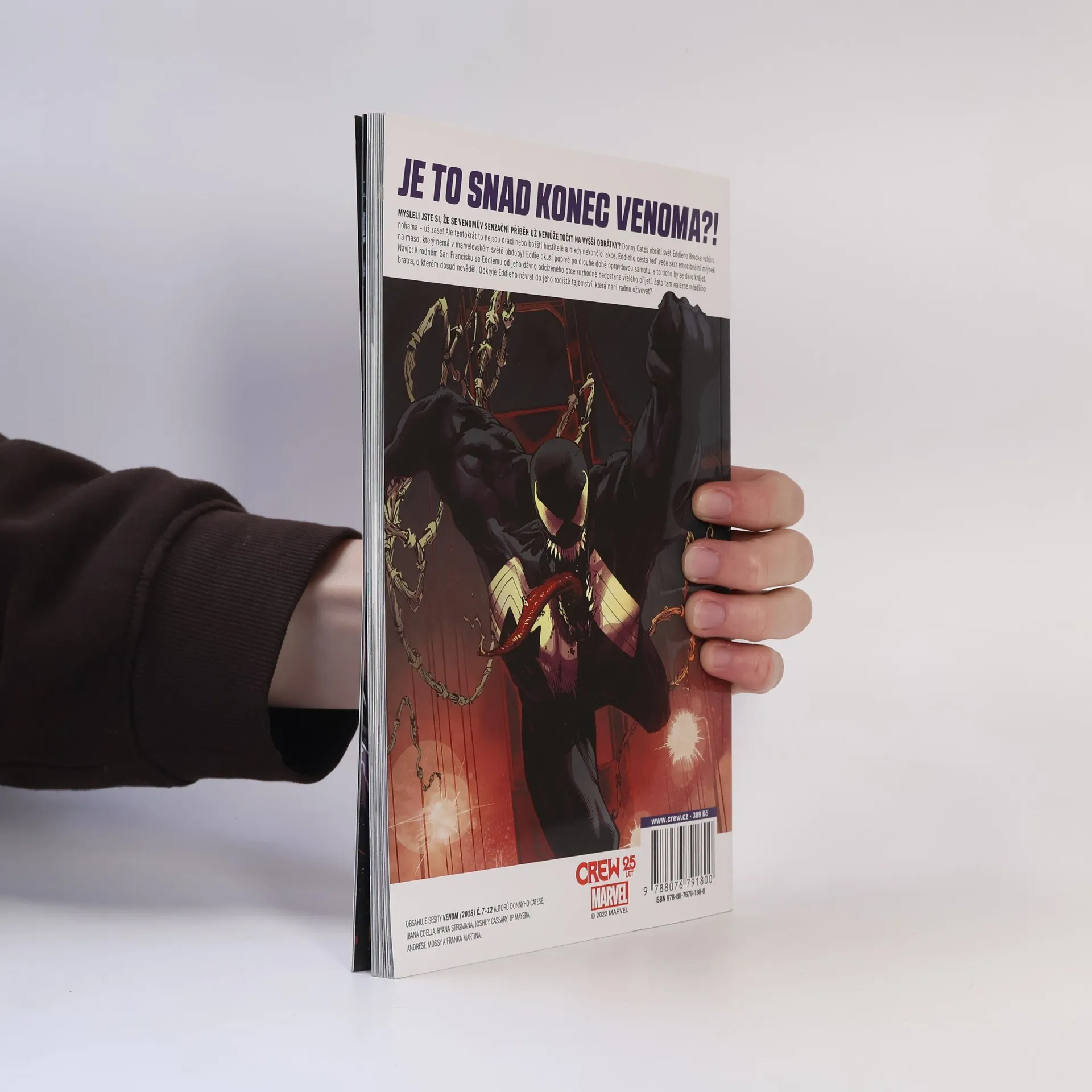 JE TO SNAD KONEC VENOMA?! MYSLELI JSTE SI, ŽE SE VENOMŮV SENZAČNÍ PŘÍBĚH UŽ NEMŮŽE TOČIT NA VYŠŠÍ OBRÁTKY? Donny Cates obrátí svět Eddieho Brocka vzhůru nohama – už zase! Ale tentokrát to nejsou draci nebo božští hostitelé a nikdy nekončící akce. Eddieho cesta teď vede skrz emocionální mlýnek na maso, který nemá v marvelovském světě obdoby! Eddie okusí poprvé po dlouhé době opravdovou samotu, a to ticho by se dalo krájet. Navíc: V rodném San Francisku se Eddiemu od jeho dávno odcizeného otce rozhodně nedostane vřelého přijetí. Zato tam nalezne mladšího bratra, o kterém dosud nevěděl. Odkryje Eddieho návrat do jeho rodiště tajemství, která není radno oživovat?