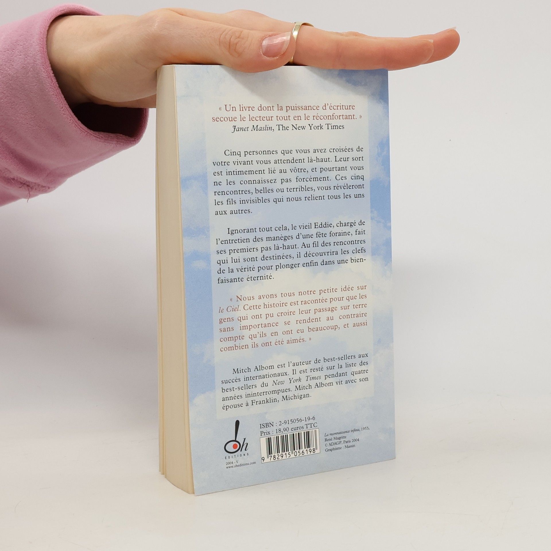 " Un livre dont la puissance d'écriture secoue le lecteur tout en le réconfortant. ", Janet Maslin, The New York Times. Cinq personnes que vous avez croisées de votre vivant vous attendent là-haut. Leur sort est intimement lié au vôtre, et pourtant vous ne les connaissez pas forcément. Ces cinq rencontres, belles ou terribles, vous révéleront les fils invisibles qui nous relient tous les uns aux autres. Ignorant tout cela, le vieil Eddie, chargé de l'entretien des manèges d'une fête foraine, fait ses premiers pas là-haut. Au fil des rencontres qui lui sont destinées, il découvrira les clefs de la vérité pour plonger enfin dans une bienfaisante éternité. " Nous avons tous notre petite idée sur le Ciel. Cette histoire est racontée pour que les gens qui ont pu croire leur passage sur terre sans importance se rendent au contraire compte qu'ils en ont eu beaucoup, et aussi combien ils ont été aimés. "