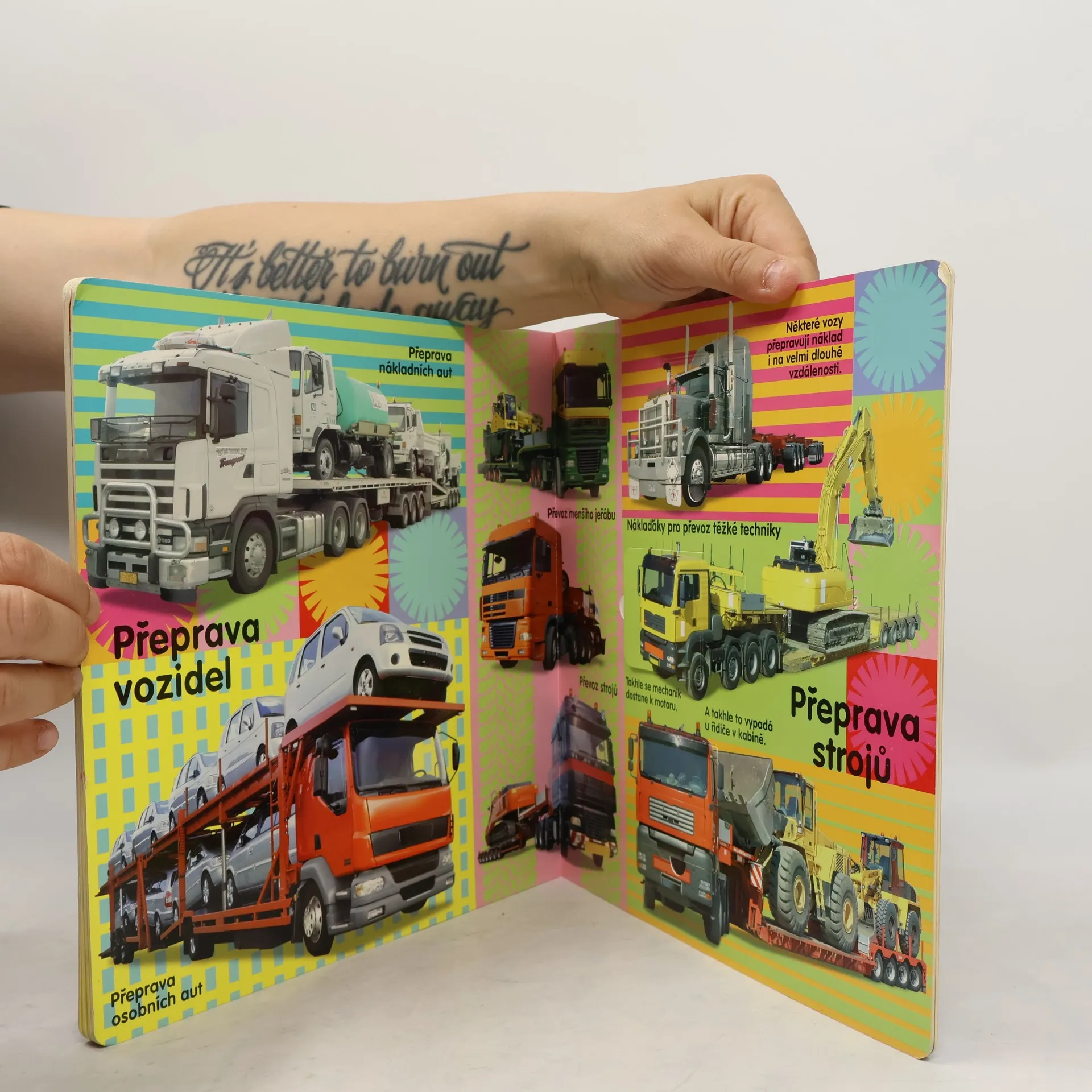 Každého kluka přitahují velké a silné náklaďáky. S tímto barevným leporelem se může stát řidičem takového obrovského auta a třeba mu i nahlédnout pod kapotu okénky v obrázcích.