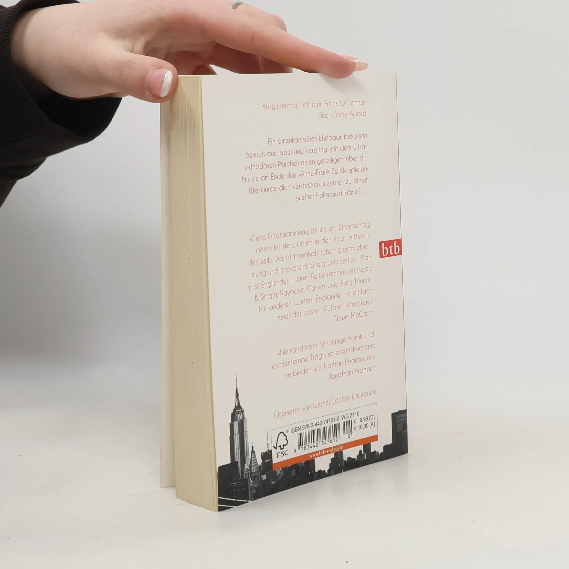 Ein amerikanisches Ehepaar trifft ein ultraorthodoxes Pärchen aus Israel und spielt schließlich das provokante »Anne-Frank-Spiel«. Die Erzählsammlung ist kraftvoll, schön und zeitlos, und wird hoch gelobt, Englander mit großen Autoren wie Singer und Carver verglichen.