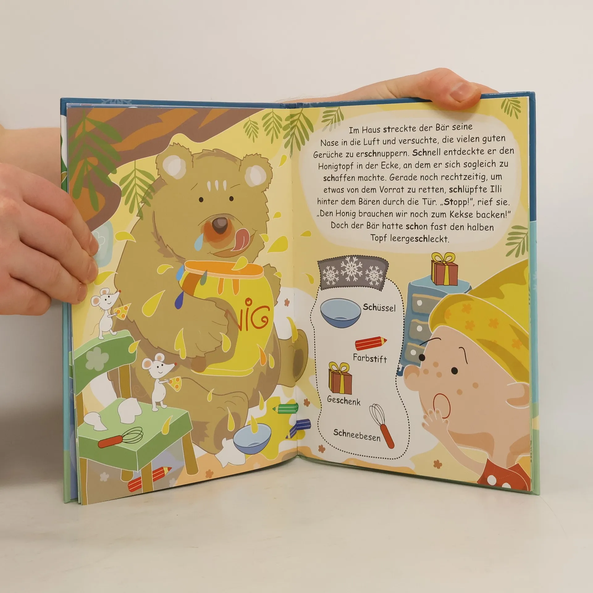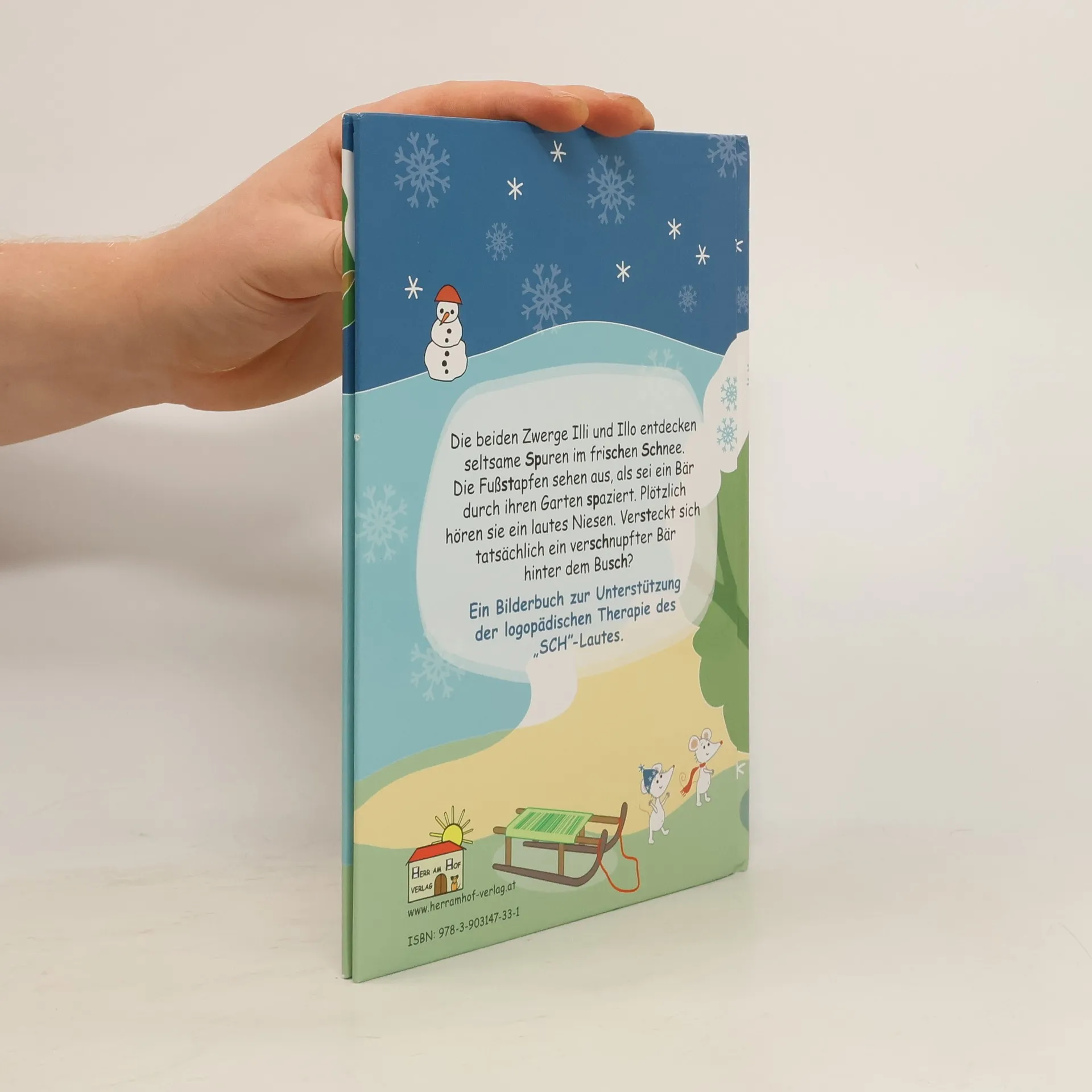Die Zwerge Illi und Illo finden im Schnee Spuren, die auf einen Bären hindeuten. Als sie ein lautes Niesen hören, fragen sie sich, ob ein verschnupfter Bär sich hinter einem Busch versteckt. Ein Bilderbuch zur logopädischen Therapie des „SCH“-Lautes.