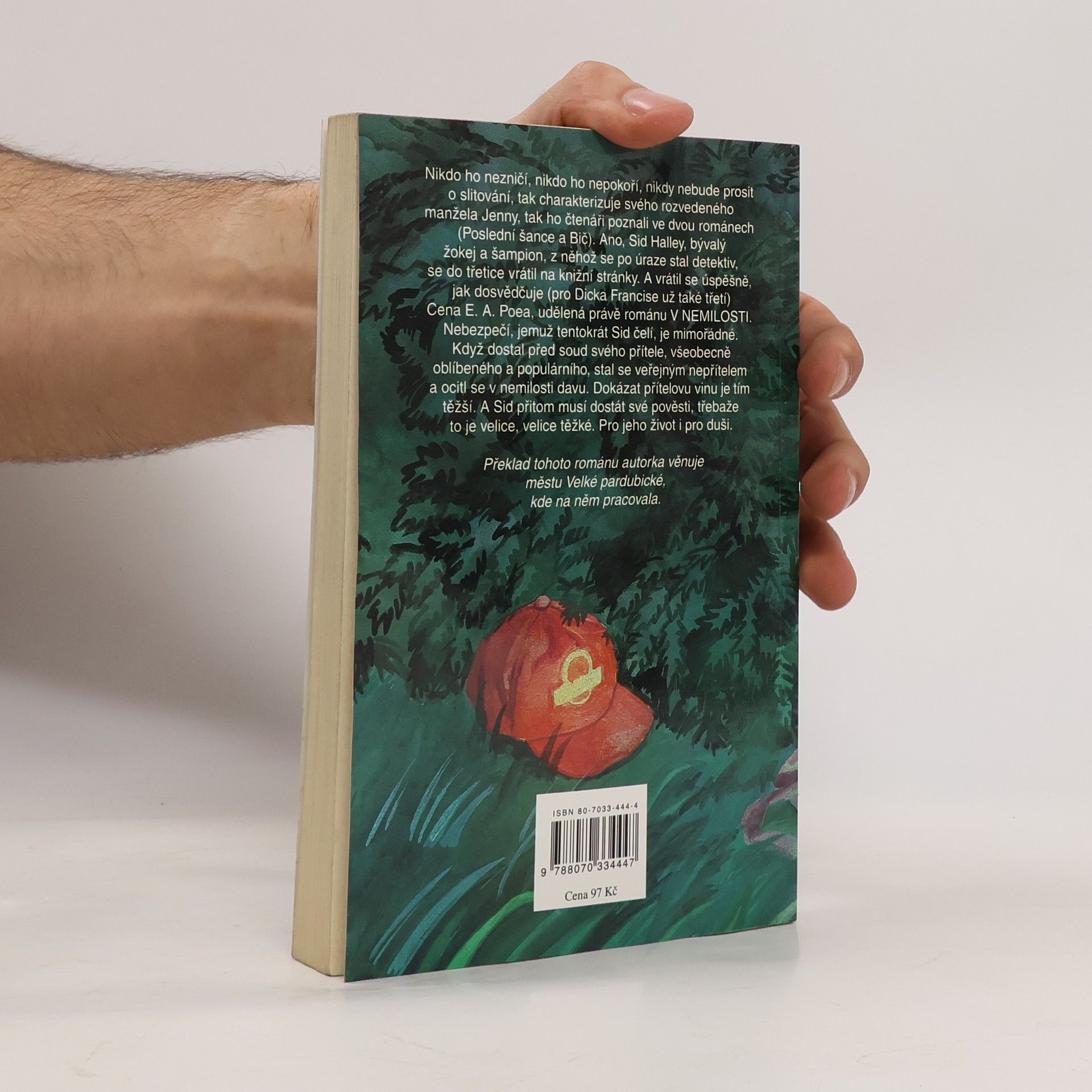 Nikdo ho nezničí, nikdo ho nepokoří, nikdy nebude prosit o slitování, tak charakterizuje svého rozvedeného manžela Jenny, tak ho čtenáři poznali ve dvou románech (Poslední šance a Bič). Ano, Sid Halley, bývalý žokej a šampion, z něhož se po úraze stal detektiv, se do třetice vrátil na knižní stránky. A vrátil se úspěšně, jak dosvědčuje (pro Dicka Francise už také třetí) Cena E. A. Poea, udělená právě románu V nemilosti. Nebezpečí, jemuž tentokrát Sid čelí, je mimořádné. Když dostal před soud svého přítele, všeobecně oblíbeného a populárního, stal se veřejným nepřítelem a ocitl se v nemilosti davu. Dokázat přítelovu vinu je tím těžší. A Sid přitom musí dostát své pověsti, třebaže to je velice těžké. Pro jeho další život i pro duši.