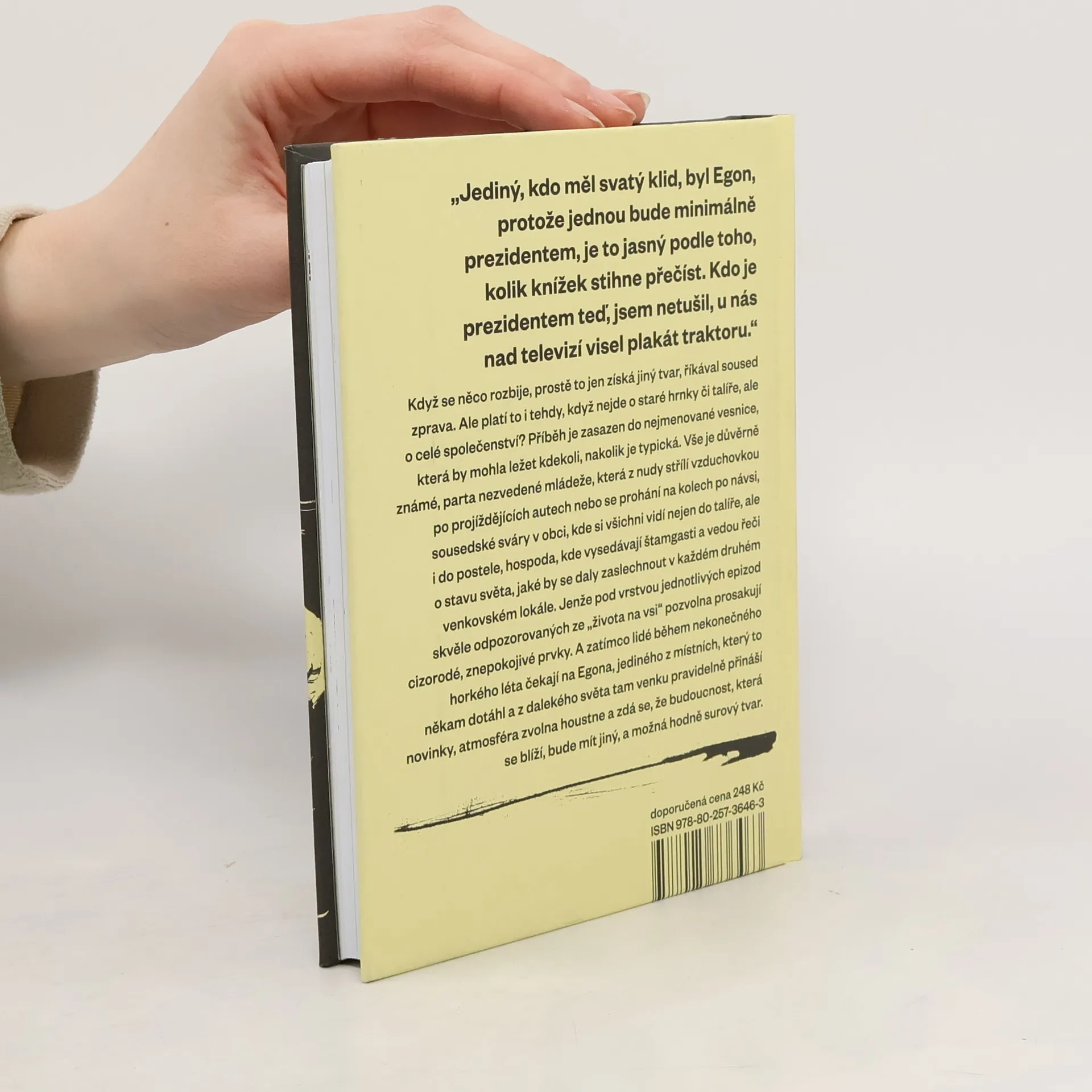 Když se něco rozbije, jenom to dostane jiný tvar, říkává s oblibou soused zprava. Ale platí to i tehdy, když nejde o staré hrnky či talíře, ale o celé společenství? Příběh jedné nejmenované vesnice, která by mohla ležet kdekoli, nakolik je typická, od počátku poněkud mate tělem. Vše je tu tak nějak povědomé, parta nezvedené mládeže, která z nudy střílí vzduchovkou po projíždějících autech nebo se prohání na kolech po návsi, sousedské řevnivosti v obci, kde si všichni vidí nejen do talíře, ale i do postele, hospoda, kde vysedávají štamgasti a vedou řeči o stavu světa, jaké by se daly zaslechnout snad v každém venkovském lokále. Jenže pod vrstvou jednotlivých epizod, skvěle odpozorovaných ze ” života na vsi“, pozvolna prosakují cizorodé, znepokojivé prvky, které obraz naprosto obyčejné vesnice narušují. A tak zatímco lidé během nekonečného horkého léta čekají na Egona, jediného člověka z vesnice, který to někam dotáhl a z dalekého světa tam venku jim rok za rokem přináší novinky, atmosféra zvolna houstne a hrozí, že budoucnost, která se blíží, bude mít oproti dnešku jiný tvar, a dost možná o hodně surovější.