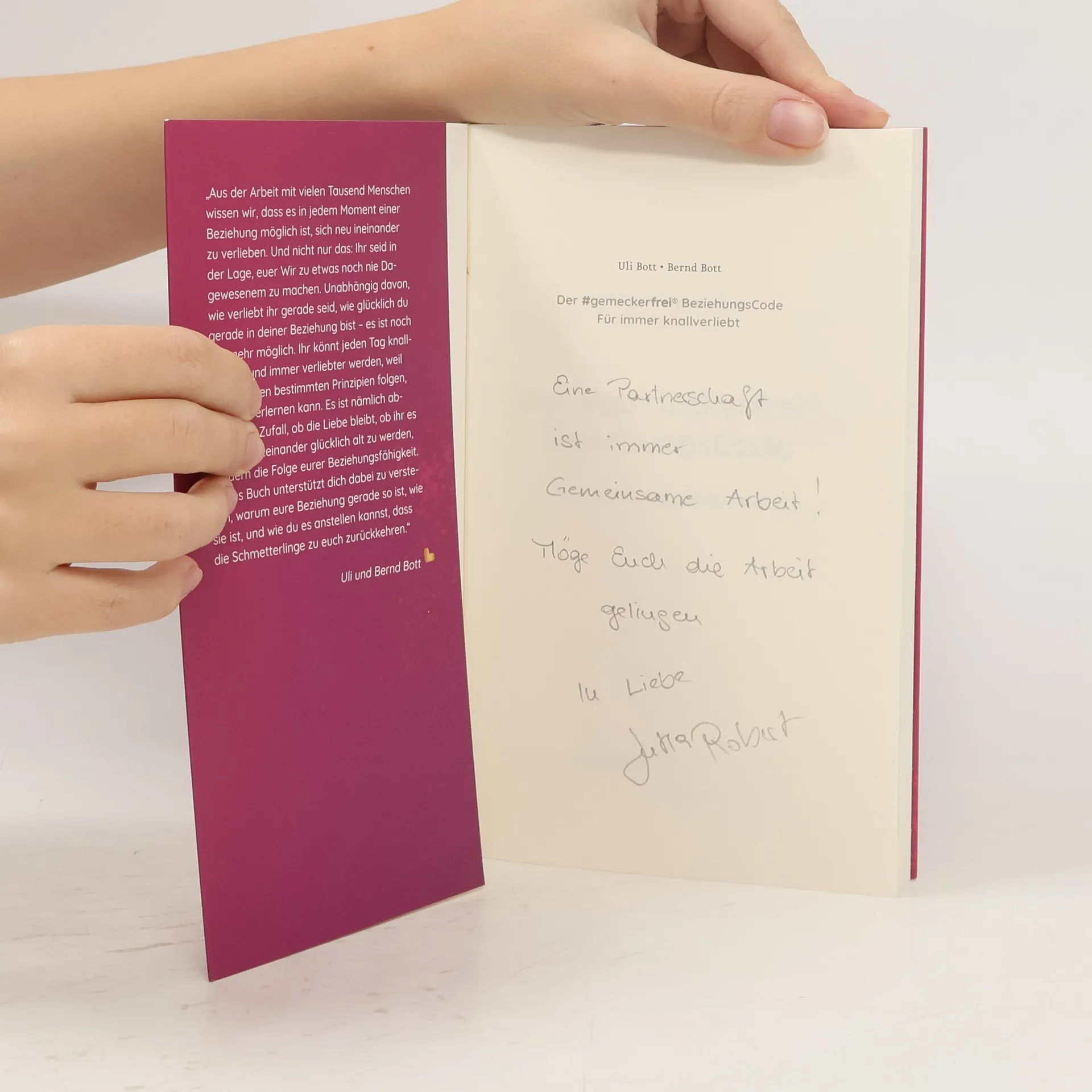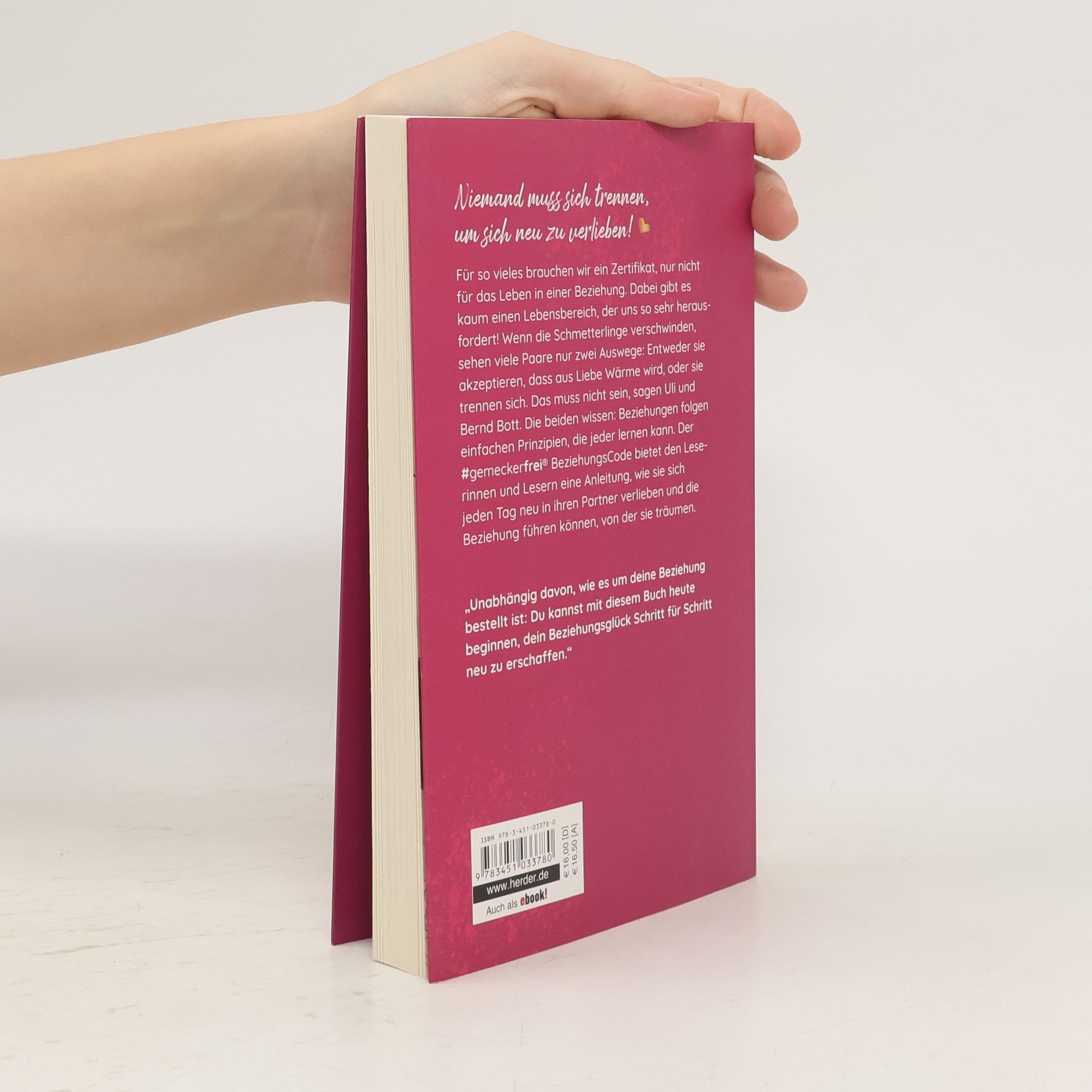 Der #gemeckerfrei®BeziehungsCode von Uli und Bernd Bott zeigt, dass Beziehungen einfachen Prinzipien folgen, die erlernbar sind. Das Buch bietet eine Anleitung, um sich täglich neu in den Partner zu verlieben und die Beziehung zu gestalten, von der man träumt. Jeder kann sein Beziehungsglück neu erschaffen.
