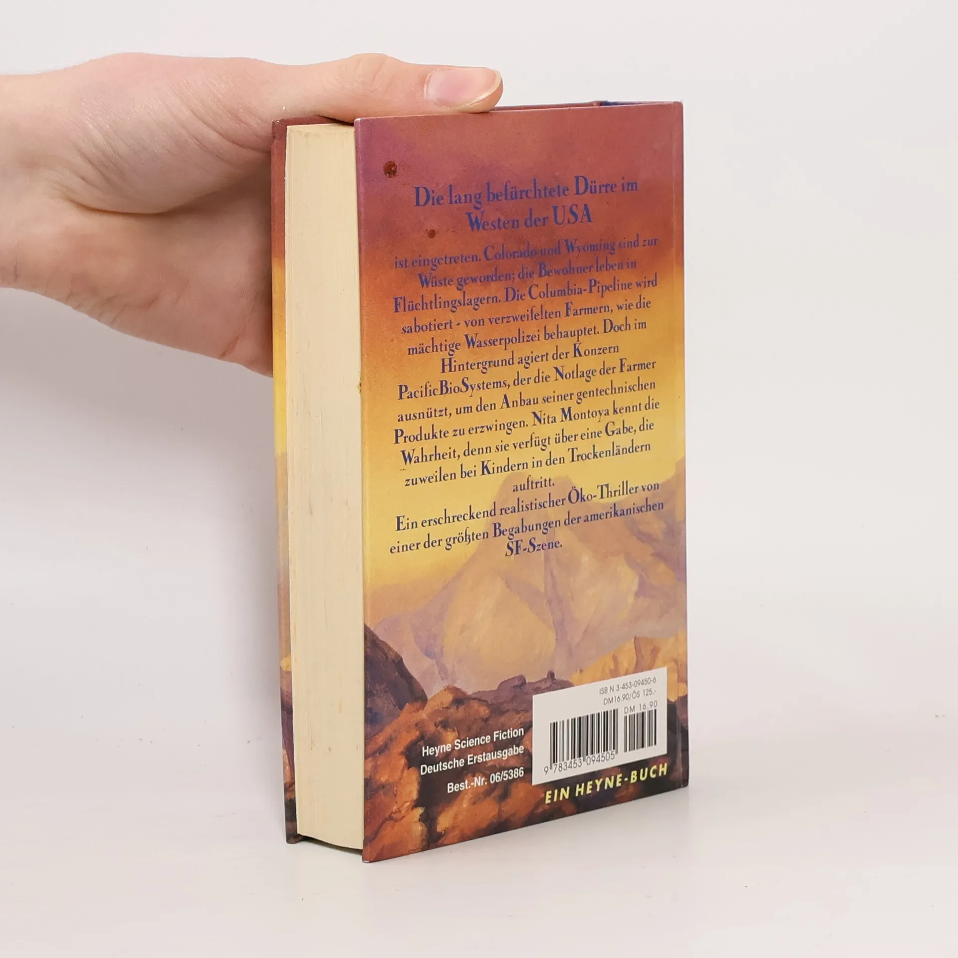 Die lang befürchtete Dürre im Westen der USA ist eingetreten. Colorado und Wyoming sind zur Wüste geworden, die Bewohner leben in Flüchtlingslagern. Die Columbia-Pipeline wird sabotiert - von verzweifelten Farmern, wie die mächtige Wasserpolizei behauptet. Doch im Hintergrund agiert der Konzern PacificBioSystems, der die Notlage der Farmer ausnützt, um den Anbau seiner gentechnischen Produkte zu erzwingen. Nita Montoya kennt die Wahrheit, denn sie verfügt über eine Gabe, die zuweilen bei Kindern in den Trockenländern auftritt. Ein erschreckend realistischer Öko-Thriller von einer der größten Begabung der amerikanischen SF-Szene.