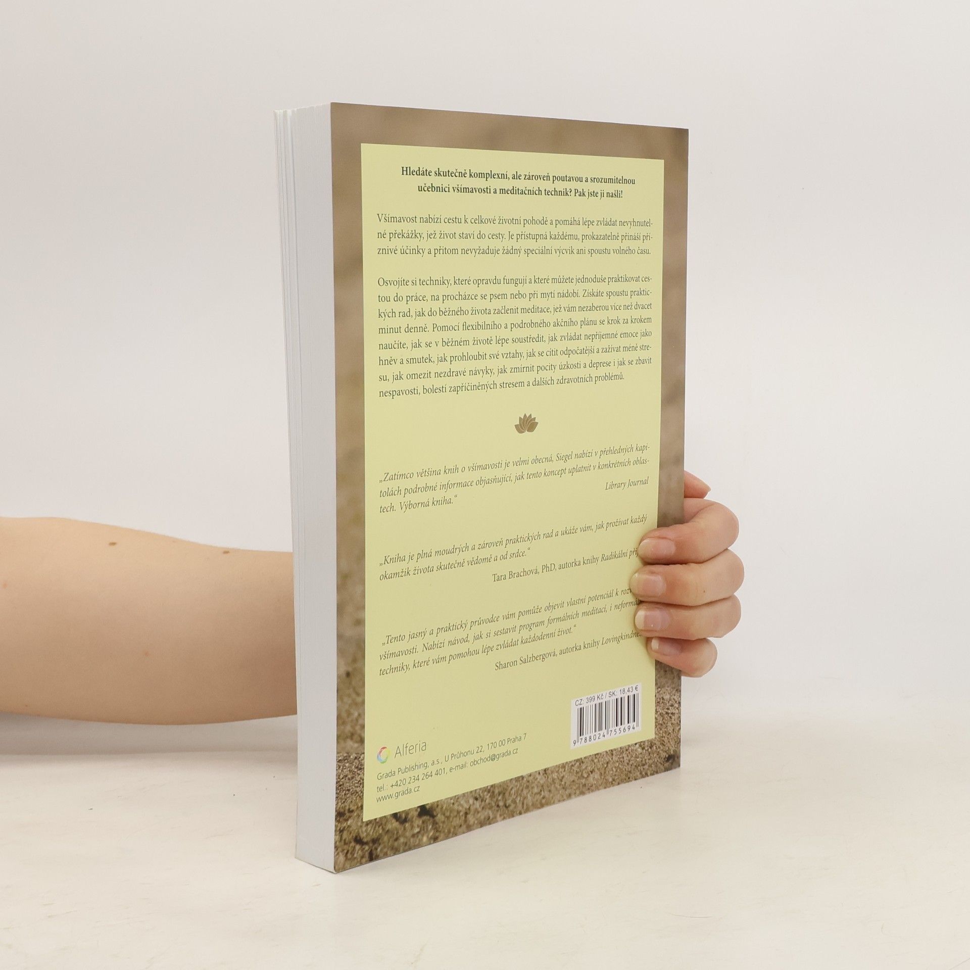 Jednoduchá cvičení pro každodenní problémy. Hledáte skutečně komplexní, ale zároveň poutavou a srozumitelnou učebnici všímavosti a meditačních technik? Pak jste ji našli! Všímavost nabízí cestu k celkové životní pohodě a pomáhá lépe zvládat nevyhnutelné překážky, jež život staví do cesty. Je přístupná každému, prokazatelně přináší příznivé účinky a přitom nevyžaduje žádný speciální výcvik ani spoustu volného času. Osvojíte si techniky, které opravdu fungují a které můžete jednoduše praktikovat cestou do práce, na procházce se psem nebo při mytí nádobí. Získáte spoustu praktických rad, jak do běžného života začlenit meditace, jež vám nezaberou více než dvacet minut denně. Pomocí flexibilního a podrobného akčního plánu se krok za krokem naučíte, jak se v běžném životě lépe soustředit, jak zvládat nepříjemné emoce jako hněv a smutek, jak prohloubit své vztahy, jak se cítit odpočatější a zažívat méně stresu, jak omezit nezdravé návyky, jak zmírnit pocity úzkosti a deprese i jak se zbavit nespavosti, bolestí zapříčiněných stresem a dalších zdravotních problémů.