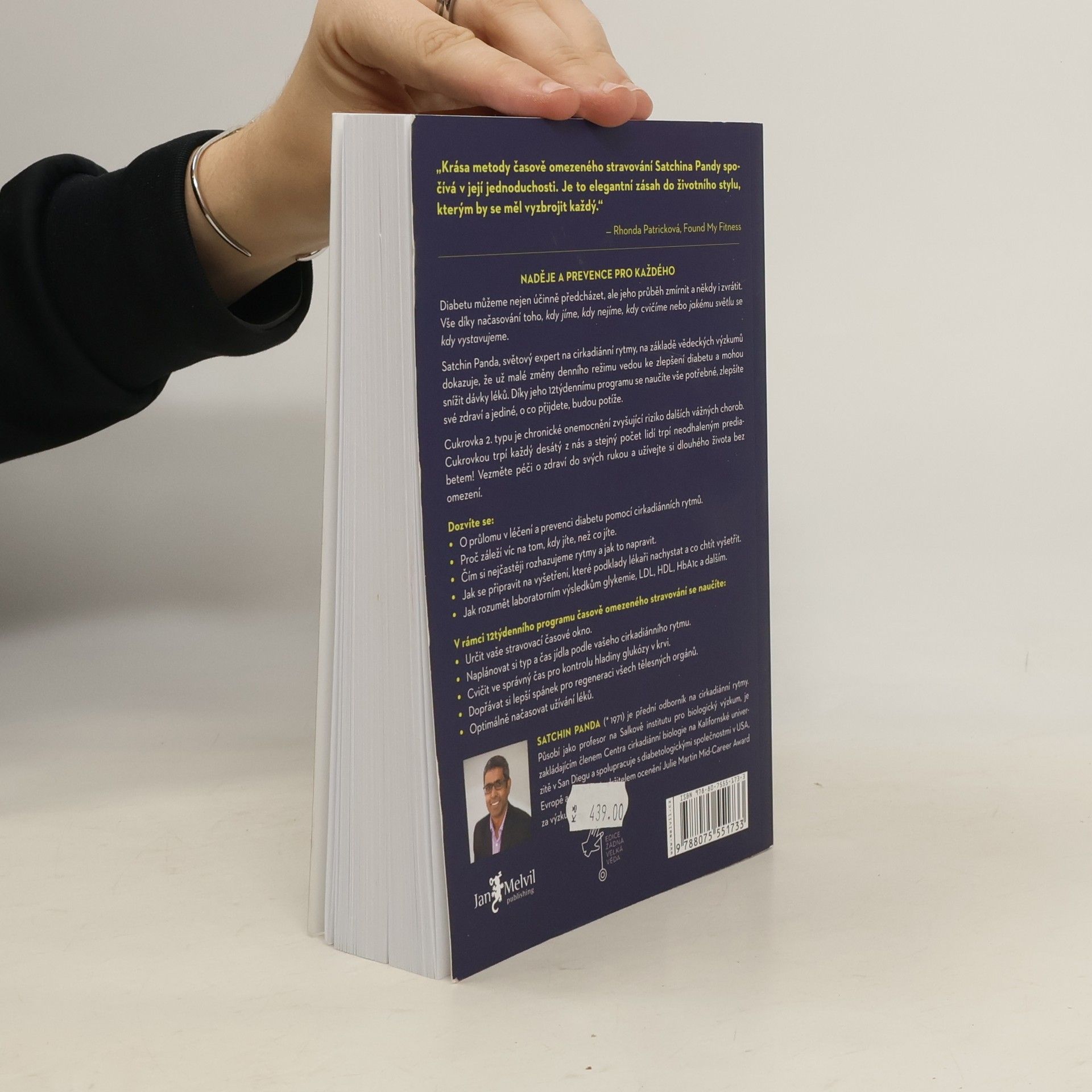 Světová autorita ve výzkumu cirkardiánních rytmů Satchin Panda i výsledky dalších vědeckých studií dokazují, že jednoduchý režim, který vyladí váš každodenní životní styl - kdy jíte, kdy spíte, kdy cvičíte a také kdy a jakému se vystavujeme světlu - s přirozeným cirkadiánním rytmem těla, může být stejně účinný v boji proti cukrovce, jako současně dostupné léky. Navíc bez vedlejších účinků. A nejlepší na tom je, že dodržování 12týdenního programu, který ve své knize autor představuje, zlepší také všechny ostatní aspekty vašeho zdraví, od zhubnutí až po posílení imunity.Přehledně a srozumitelně zjistíte, jak sestavit denní režim přizpůsobený svému tělu na míru i jak si osvojit přerušovaný půst. Tato jednoduchá opatření optimalizují hladinu glukózy v krvi a také přirozeně snižují riziko vzniku srdečních onemocnění a obezity.