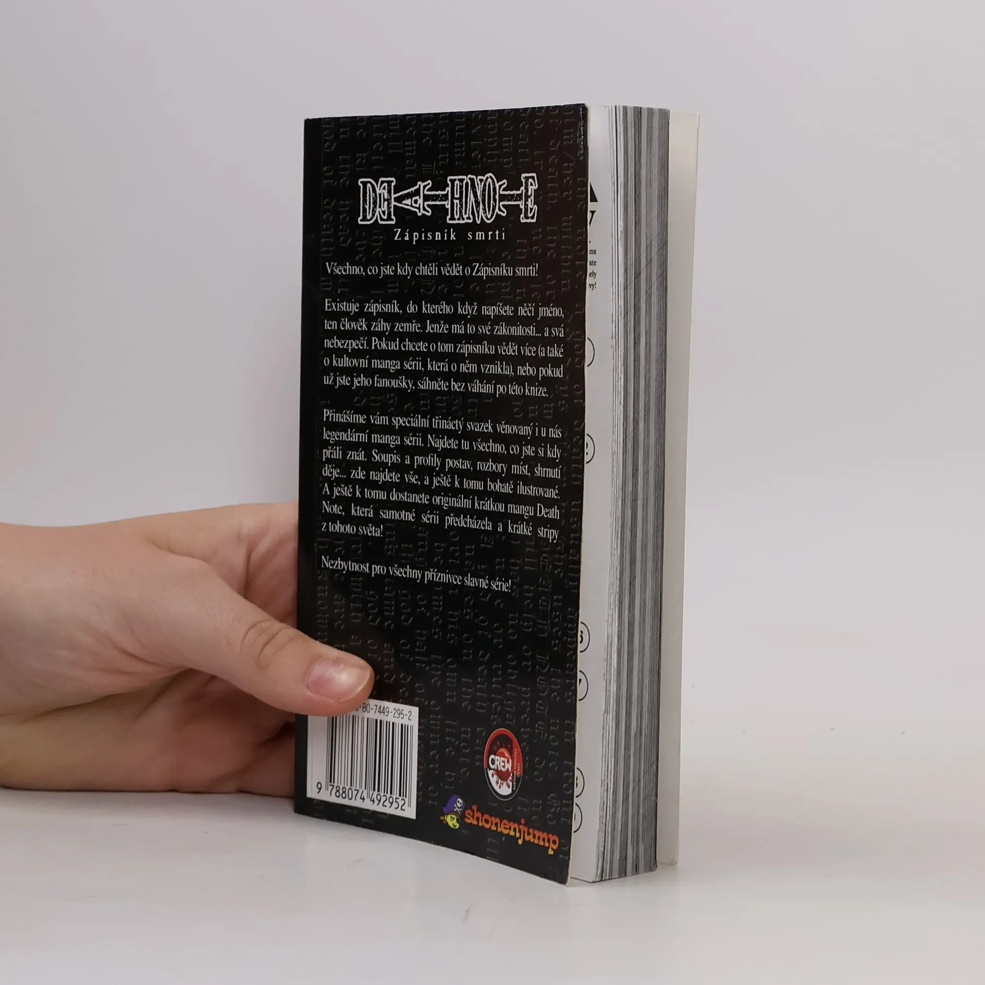 Všechno, co jste kdy chtěli vědět o Zápisníku smrti! Existuje zápisník, do kterého když napíšete něčí jméno, ten člověk do několika minut zemře. Jenže má to své zákonitosti... a svá nebezpečí. Pokud chcete o tom zápisníku vědět více (a také o kultovní manga sérii, která o něm vznikla), nebo pokud už jste jeho fanoušky, sáhněte bez váhání po této knize. Přinášíme vám speciální třináctý svazek věnovaný i u nás legendární manga sérii. Najdete tu všechno, co jste si kdy přáli znát. Soupis a profily postav, rozbory míst, shrnutí děje... zde najdete vše, a ještě k tomu bohatě ilustrované. A ještě k tomu dostanete originální krátkou mangu Death Note, která samotné sérii předcházela a krátké stripy z tohoto světa!