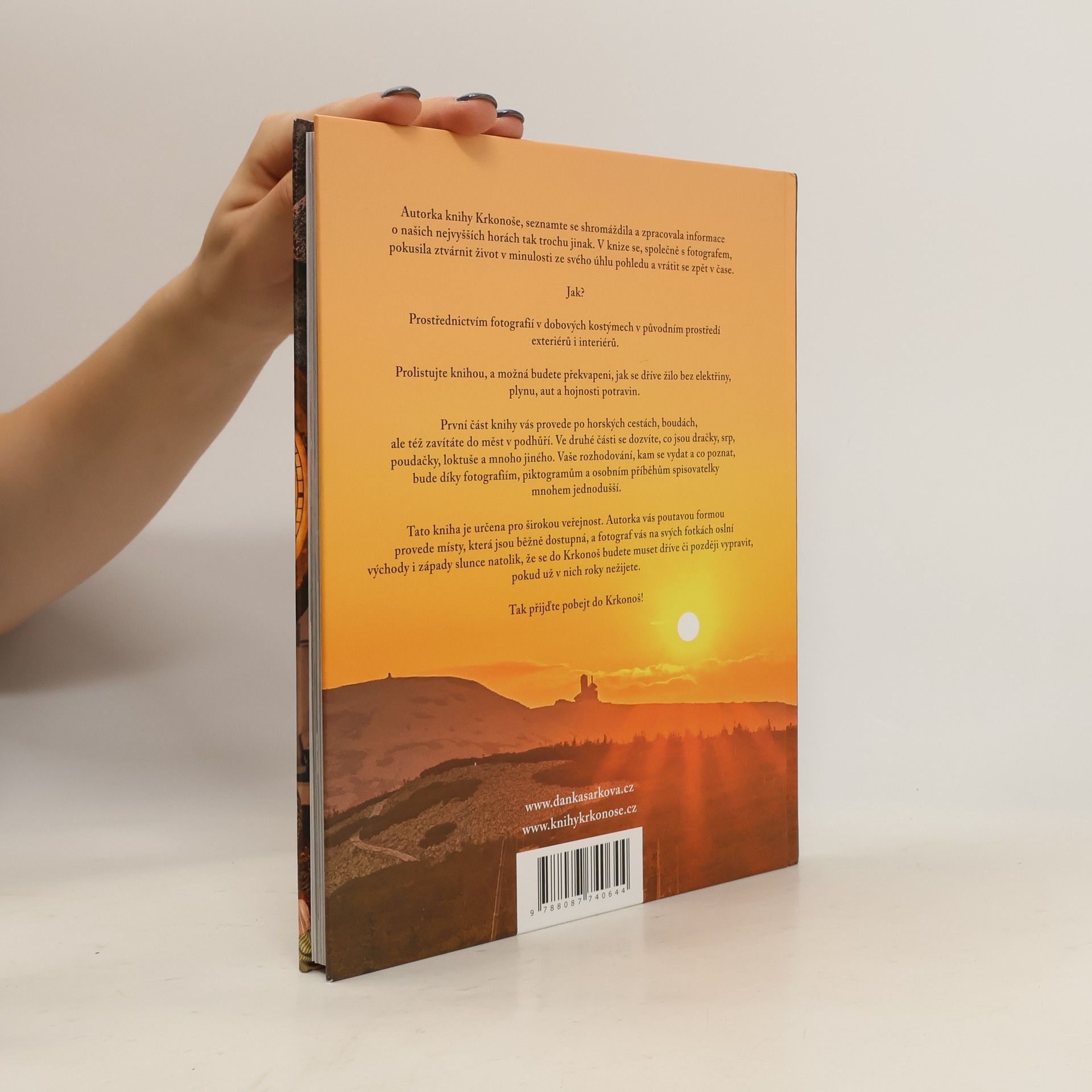 Autorka knihy Krkonoše, seznamte se! shromáždila a zpracovala informace o našich nejvyšších horách tak trochu jinak. V knize se, společně s fotografem, pokusila ztvárnit život v minulosti ze svého úhlu pohledu a vrátit se zpět v čase.Jak?Prostřednictvím fotografií v dobových kostýmech v původním prostředí exteriérů i interiérů.Prolistujte knihou, a možná budete překvapeni, jak se dříve žilo bez elektřiny, plynu, aut a hojnosti potravin.První část knihy vás provede po horských cestách, boudách, ale též zavítáte do měst v podhůří. Ve druhé části se dozvíte, co jsou dračky, srp, poudačky, loktuše a mnoho jiného. Vaše rozhodování, kam se vydat a co poznat, bude díky fotografiím, piktogramům a osobním příběhům autorky mnohem jednodušší.Tato kniha je určena pro širokou veřejnost. Autorka vás poutavou formou provede do míst, která jsou běžně dostupná, a fotograf vás na svých fotkách oslní východy i západy slunce natolik, že se do Krkonoš budete muset dříve či později vypravit, pokud už v nich roky nežijete.Tak přijďte pobejt do Krkonoš!