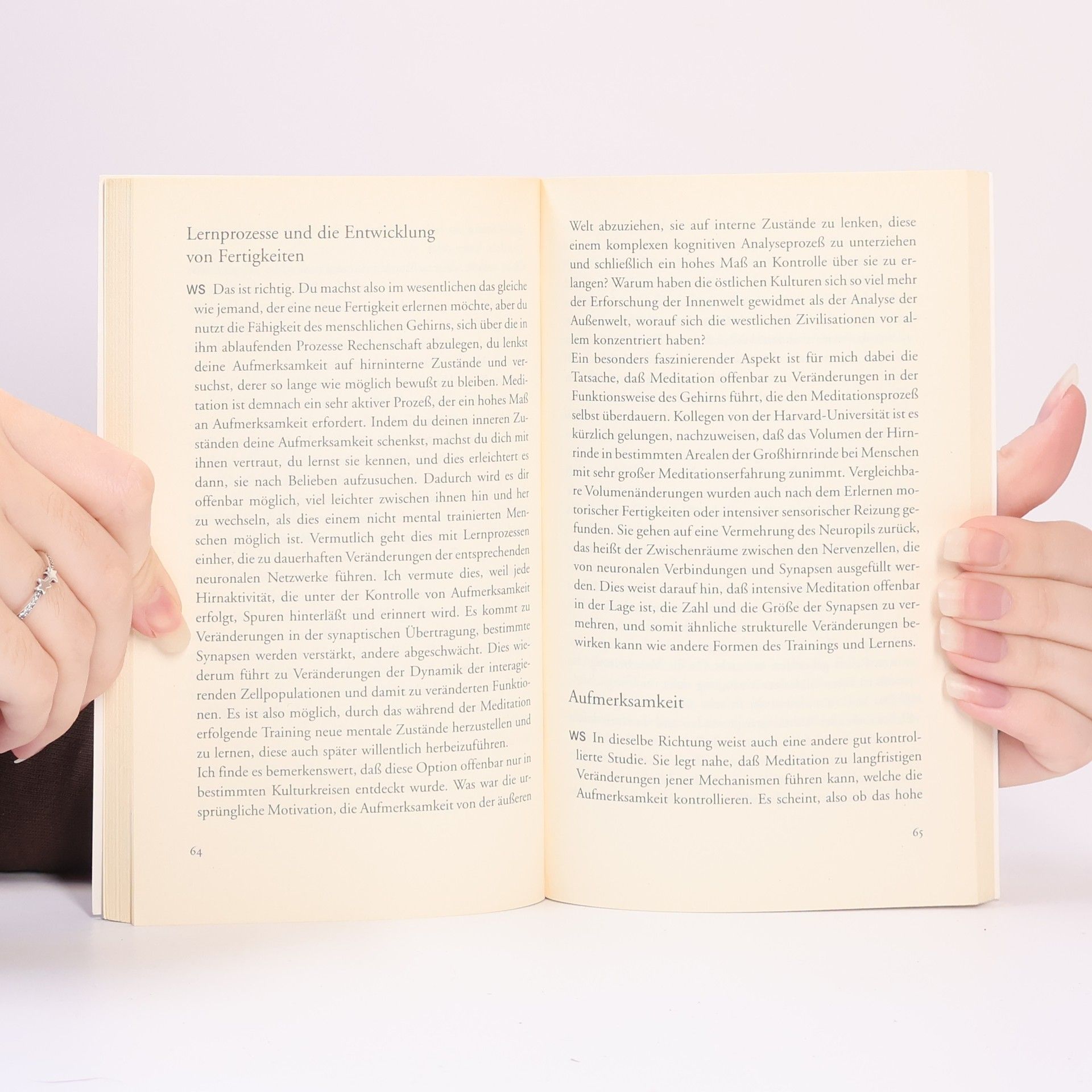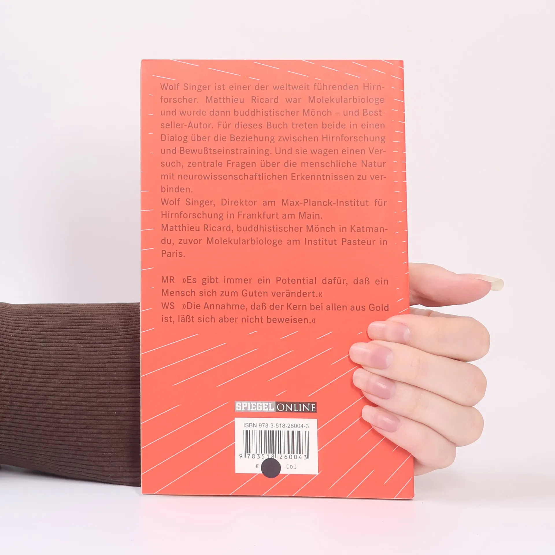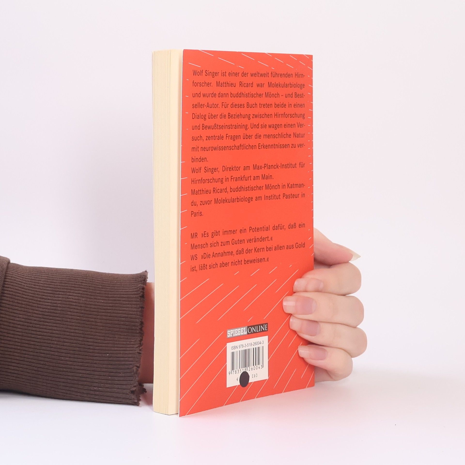 Wolf Singer, ein führender Hirnforscher, und Matthieu Ricard, ein ehemaliger Molekularbiologe und buddhistischer Mönch, treten in einen Dialog über die Verbindung zwischen Hirnforschung und Bewusstseinstraining. Sie erörtern, welche mentalen Zustände durch meditative Praktiken erreicht werden sollen und welche neuronalen Prozesse dabei eine Rolle spielen. Zudem wird die Frage aufgeworfen, ob regelmäßige Meditation nachweisbare Veränderungen in den Hirnfunktionen bewirken kann. Ihr Werk fördert den Austausch zwischen Naturwissenschaften und kontemplativen Wissenschaften, wobei der Buddhismus hier als „Wissenschaft über den Geist“ betrachtet wird, nicht als Religion. Ein zentrales Thema ist das Training von Geist und menschlichen Werten, wie Aufmerksamkeit, Altruismus, emotionale Ausgeglichenheit und Glück. Singer und Ricard diskutieren auch die Langzeitwirkungen dieses Trainings. Während die Anpassungsfähigkeit des Gehirns oft im Kontext äußerer Veränderungen untersucht wird, kommen bei der Meditation die Impulse von innen, was eine systematische Veränderung der eigenen mentalen Dispositionen anstrebt. Sie stellen die Frage, ob zentrale Aspekte der menschlichen Natur mit neurowissenschaftlichen Erkenntnissen verknüpft werden können.