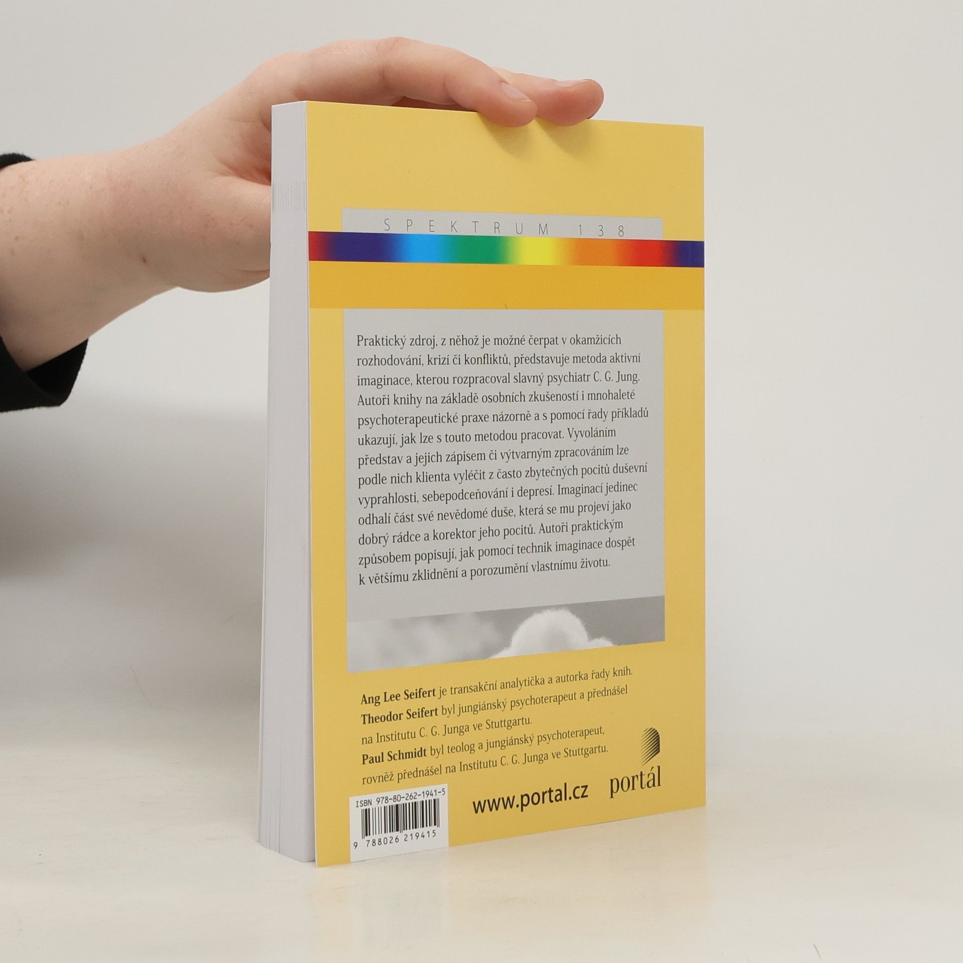 Praktický zdroj, z něhož lze čerpat v okamžicích rozhodování, krizí či konfliktů, představuje metoda aktivní imaginace, kterou rozpracoval slavný psychiatr C. G. Jung. Autoři knihy na základě osobních zkušeností i mnohaleté psychoterapeutické praxe názorně a s pomocí řady příkladů ukazují, jak lze s touto metodou pracovat. Vyvoláním představ a jejich zápisem či výtvarným zpracováním lze podle nich klienta vyléčit z často zbytečných pocitů duševní vyprahlosti, sebepodceňování i depresí. Imaginací jedinec odhalí část své nevědomé duše, která se mu projeví jako dobrý rádce a korektor jeho pocitů. Autoři praktickým způsobem popisují, jak pomocí technik imaginace dospět k většímu zklidnění a porozumění vlastnímu životu. Ang Lee Seifert je transakční analytička a autorka řady knih. Theodor Seifert je jungiánský psychoterapeut a přednáší na Institutu C. G. Junga ve Stuttgartu. Paul Schmidt je teolog a jungiánský psychoterapeut, rovněž přednáší na Institutu C. G. Junga ve Stuttgartu.