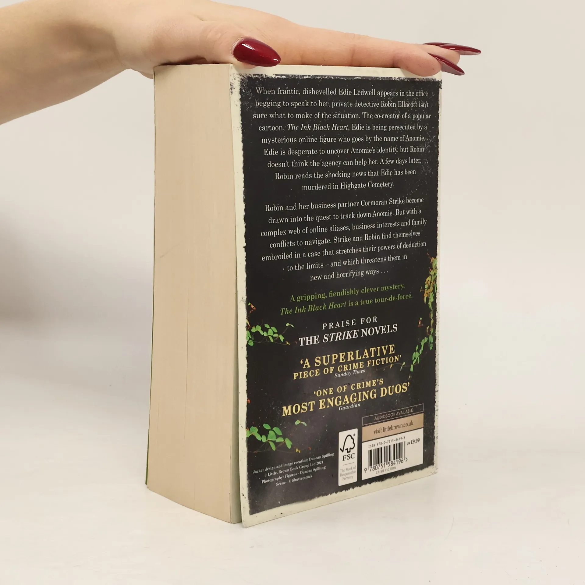 When frantic, dishevelled Edie Ledwell appears in the office begging to speak to her, private detective Robin Ellacott doesn't know quite what to make of the situation. The co-creator of a popular cartoon, The Ink Black Heart, Edie is being persecuted by a mysterious online figure who goes by the pseudonym of Anomie. Edie is desperate to uncover Anomie's true identity. Robin decides that the agency can't help with this - and thinks nothing more of it until a few days later, when she reads the shocking news that Edie has been tasered and then murdered in Highgate Cemetery, the location of The Ink Black Heart. Robin and her business partner Cormoran Strike become drawn into the quest to uncover Anomie's true identity. But with a complex web of online aliases, business interests and family conflicts to navigate, Strike and Robin find themselves embroiled in a case that stretches their powers of deduction to the limits - and which threatens them in new and horrifying ways . . . A gripping, fiendishly clever mystery, The Ink Black Heart is a true tour-de-force.