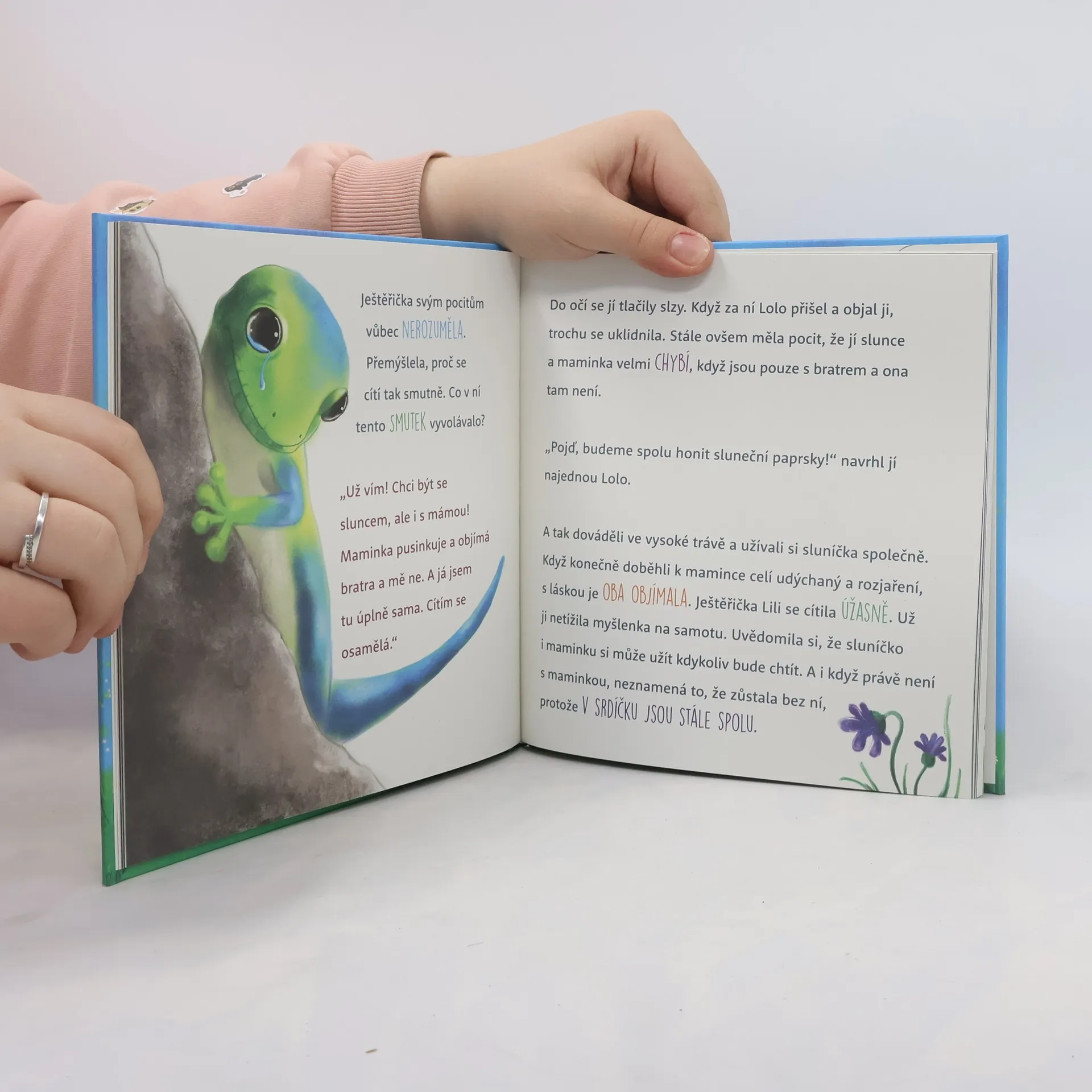 Knížka o sourozencích a lásce mámy k dětem vypráví příběh o dvou ještěřičkách, který pocítíte až v duši. Inspiruje děti podívat se do svého srdíčka, pojmenovat vlastní pocity, pochopit je a přijmout. A tak poznat sebe samé. Bratr a sestra, Lolo a Lili, si myslí, že sluníčka, které velmi milují, mají málo. Přemýšlejí nad tím, jestli se sluníčko vrátí, když se na chvíli ztratí za mraky, a na koho vlastně svítí víc. Vydají se na výlet, aby našli místo, kde slunce svítí nejvíc. Objeví však něco velmi důležitého. Nakladatelská anotace.