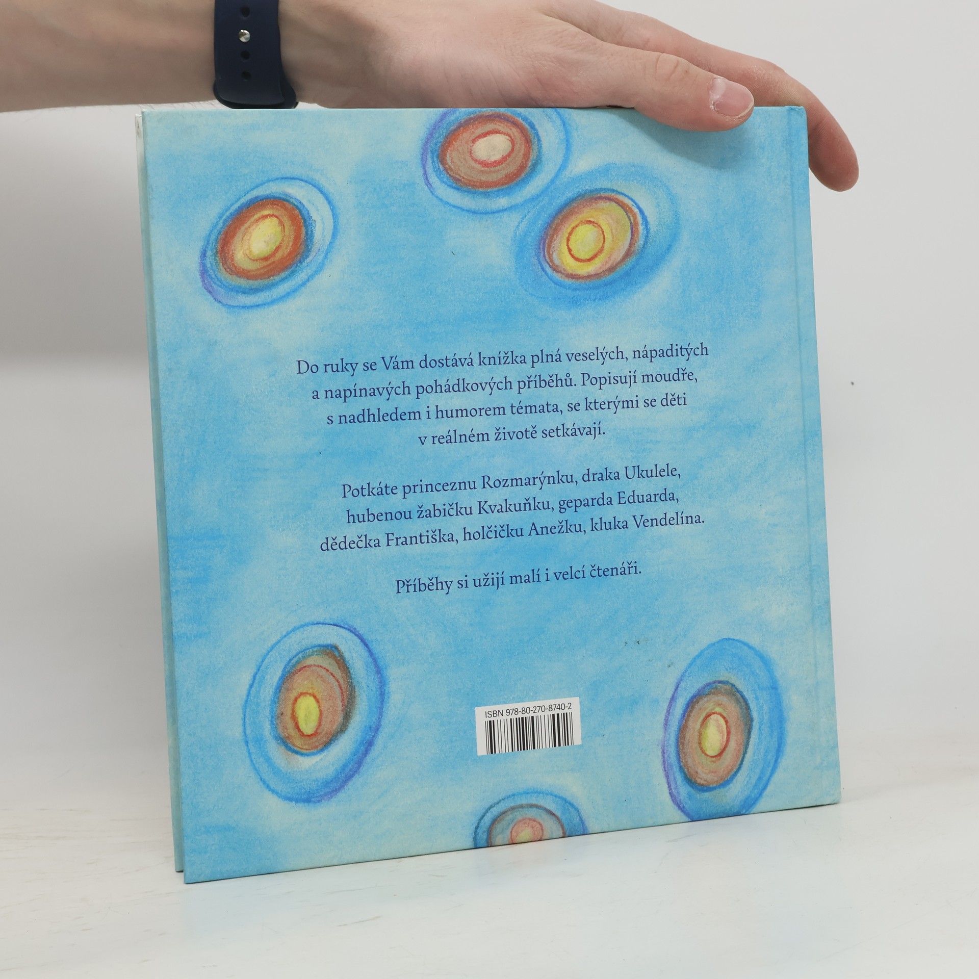 Do ruky se Vám dostává knížka plná veselých, nápaditých a napínavých pohádkových příběhů. Popisují moudře, s nadhledem i humorem témata, se kterými se děti v reálném životě setkávají. Potkáte princeznu Rozmarýnku, draka Ukulele, hubenou žabičku Kvakuňku, deparda Eduarda, dědečka Františka, holčičku Anežku, kluka Vendelína. Příběhy si užijí malí i velcí čtenáři. Autorka knížky je psychoterapeutka. Myslí také na rodiče, kteří knížku s dětmi budou číst, tónem laskavým se v příbězích dotýká i témat složitých. Třeba když jíme moc nebo zase příliš málo, když si neumíme všimnout, že pro nás je tablet víc než kamarádi, když se zlobíme a nedovedem odpustit ani sami sobě, když nám to ve škole nejde, jak málo radosti se vejde, když chceme vždycky všechno dělat správně. Pohádkové příběhy jsou psány dětem na prvním stupni základní školy. V rodinách, kde se hodně čte, pak knížce porozumí i děti těsně předškolní. Příběhy jsou dlouhé tak akorát na večerní čtení, dopadnou dobře a hezky se po nich usíná. Obrázky jsou celostránkové, vlídné a barevné, malým čtenářům se líbí. Větší písmenka jsou vhodná i pro začínající čtenáře.