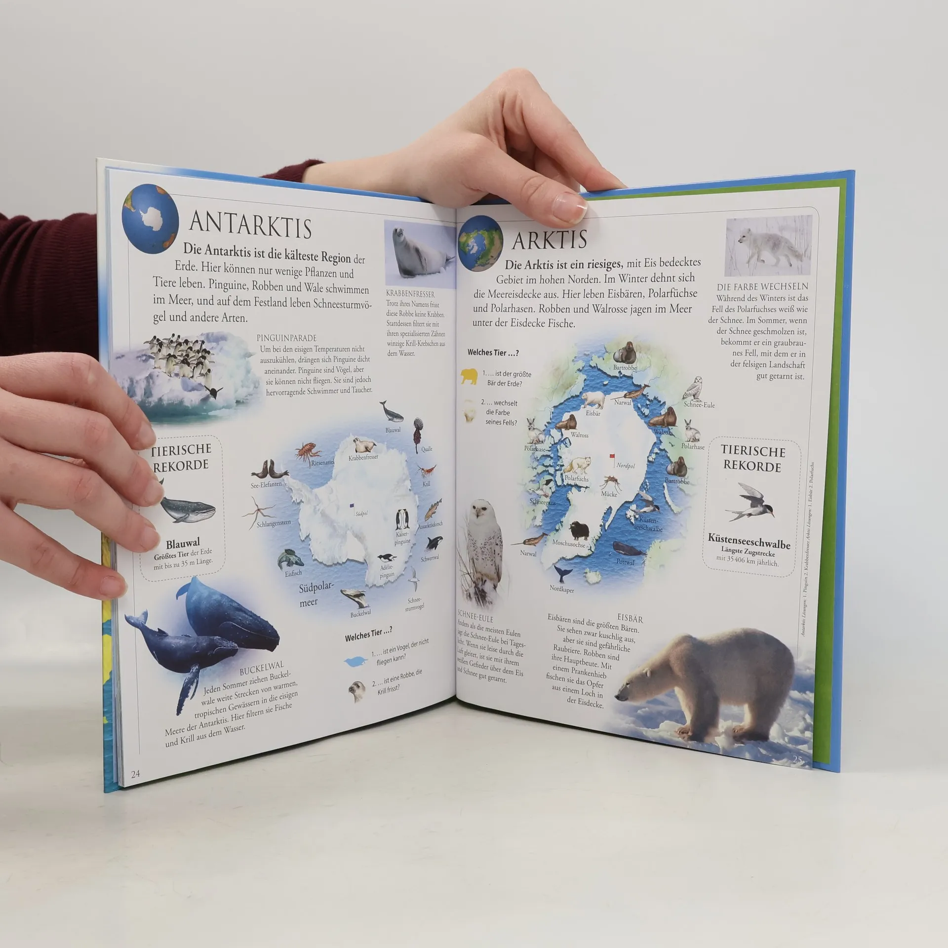 Wo leben Braunbären? Gibt es in Afrika Tiger? Dieser außergewöhnliche Tieratlas macht Lust auf Entdeckungen und hält jede Menge Extras bereit! Gleich zu Beginn öffnet sich eine spektakuläre Pop-up-Tierwelt! Große Bildkarten zeigen die für einen Erdteil typischen Arten, Karten zum Herausziehen die unterschiedlichen Lebensräume. Ausklappbare Seiten halten Wissenswertes über die einzelnen Tierarten bereit wie z. B. Größe, Lebenserwartung oder Anzahl der Jungen. Quizfragen auf jeder Seite regen dazu an, alles ganz genau zu lesen und anzusehen. Ein liebevoll illustrierter und aufwendig gestalteter Atlas - zum Schieben, Aufklappen und Staunen! Ab 4 Jahren