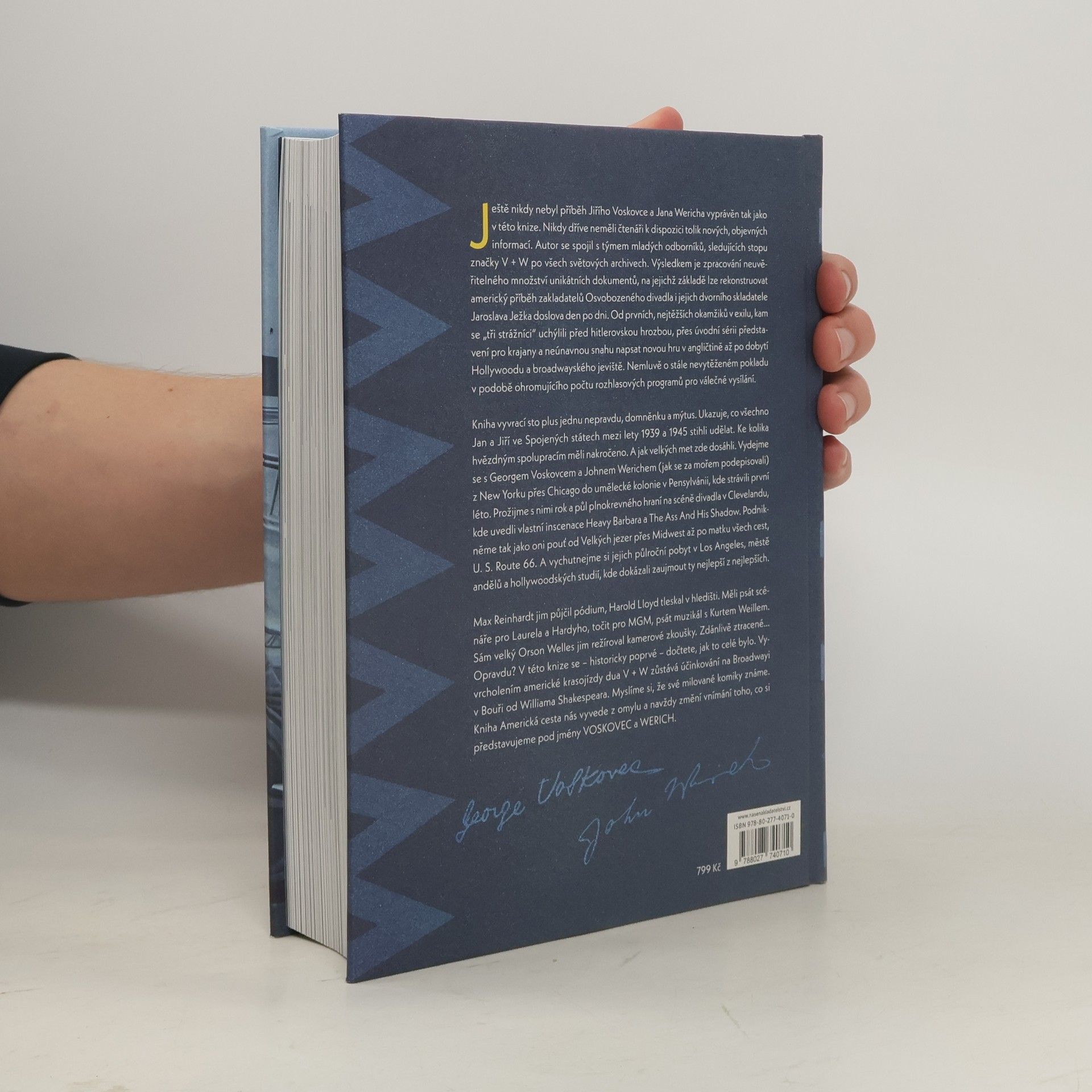 Ještě nikdy nebyl příběh Jiřího Voskovce a Jana Wericha vyprávěn tak jako v této knize. Autor se spojil s týmem mladých odborníků, sledujících stopu značky V + W po všech světových archivech. Výsledkem je zpracování neuvěřitelného množství unikátních dokumentů, na jejichž základělze rekonstruovat americký příběh zakladatelů Osvobozeného divadla i jejich dvorního skladatele Jaroslava Ježka doslova den po dni. Kniha vyvrací sto plus jednu nepravdu, domněnku a mýtus. Ukazuje, co všechno Jan a Jiří ve Spojených státech dokázali. Kdo z legend jim pomáhal a fandil. A jak velkých met zde dosáhli. Vydejme se s Georgem Voskovcem a Johnem Werichem (jak se za mořem podepisovali) z New Yorku přes Chicago do umělecké kolonie v Pensylvánii. Prožijme s nimi rok a půl hraní na scéně divadla v Clevelandu, kde uvedli vlastní inscenace. Podnikněme tak jako oni dobrodružnou pouť od Velkých jezer přes Midwest až po matku všech cest, U. S. Route 66. A vychutnejme si jejich půlroční pobyt v Los Angeles, kde dokázali zaujmout ty nejlepší z nejlepších. V této knize se – historicky poprvé – dočtete, jak to celé bylo. Myslíme si, že své milované komiky známe. Kniha Americká cesta nás vyvede z omylu a navždy změní vnímání toho, co si představujeme pod jmény VOSKOVEC a WERICH.