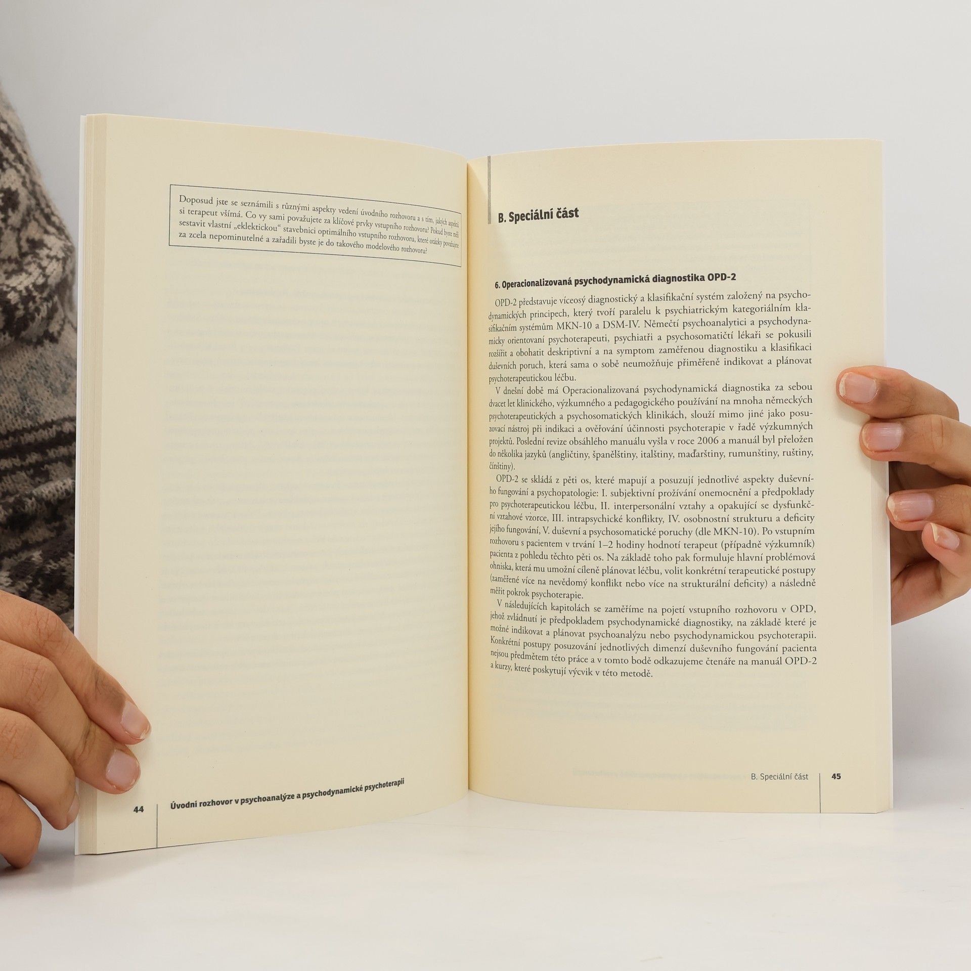 Studijní text předkládá problematiku úvodního psychodynamicky vedeného rozhovoru, který tvoří základ pro stanovení vhodnosti psychoanalytické/psychodynamické léčby pacienta, plánování léčby a zachycení terapeutických změn. Obecná část přibližuje základní principy úvodního vyšetření, kompetence terapeuta a objasňuje vedení rozhovoru v pojetí různých psychoanalytických/psychodynamických autorů. Druhá speciální část se zaměřuje na moderní víceosý diagnostický systém OPD-2 (Operacionalizovaná psychodynamická diagnostika, druhá revize) a jeho pojetí polostrukturovaného diagnosticko-terapeutického rozhovoru.