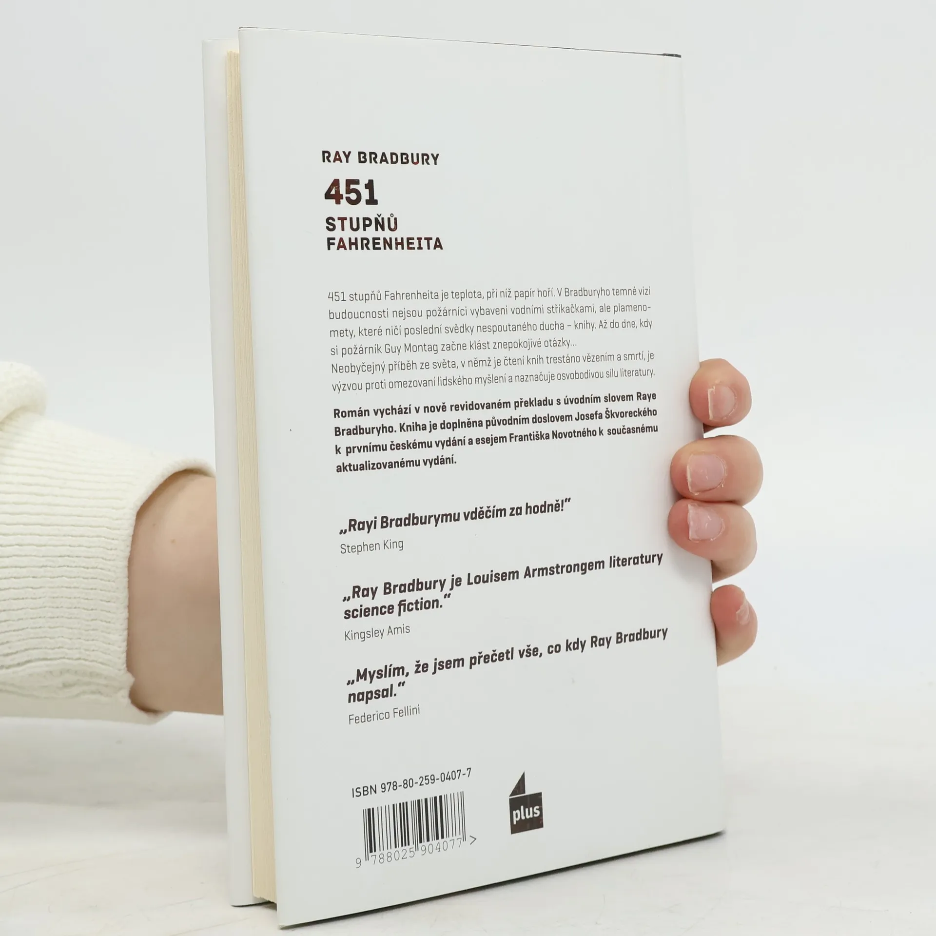 451 stupňů Fahrenheita je teplota, při níž papír hoří. V Bradburyho temné vizi budoucnosti nejsou hasiči vybaveni vodními stříkačkami, ale plamenomety, které ničí poslední svědectví svobodného myšlení – knihy. Až do dne, kdy si hasič Guy Montag začne klást znepokojivé otázky… Román vychází v nově revidovaném překladu s úvodním slovem Raye Bradburyho. Kniha je doplněna původním doslovem Josefa Škvoreckého k prvnímu českému vydání a esejem Františka Novotného k současnému aktualizovanému vydání.