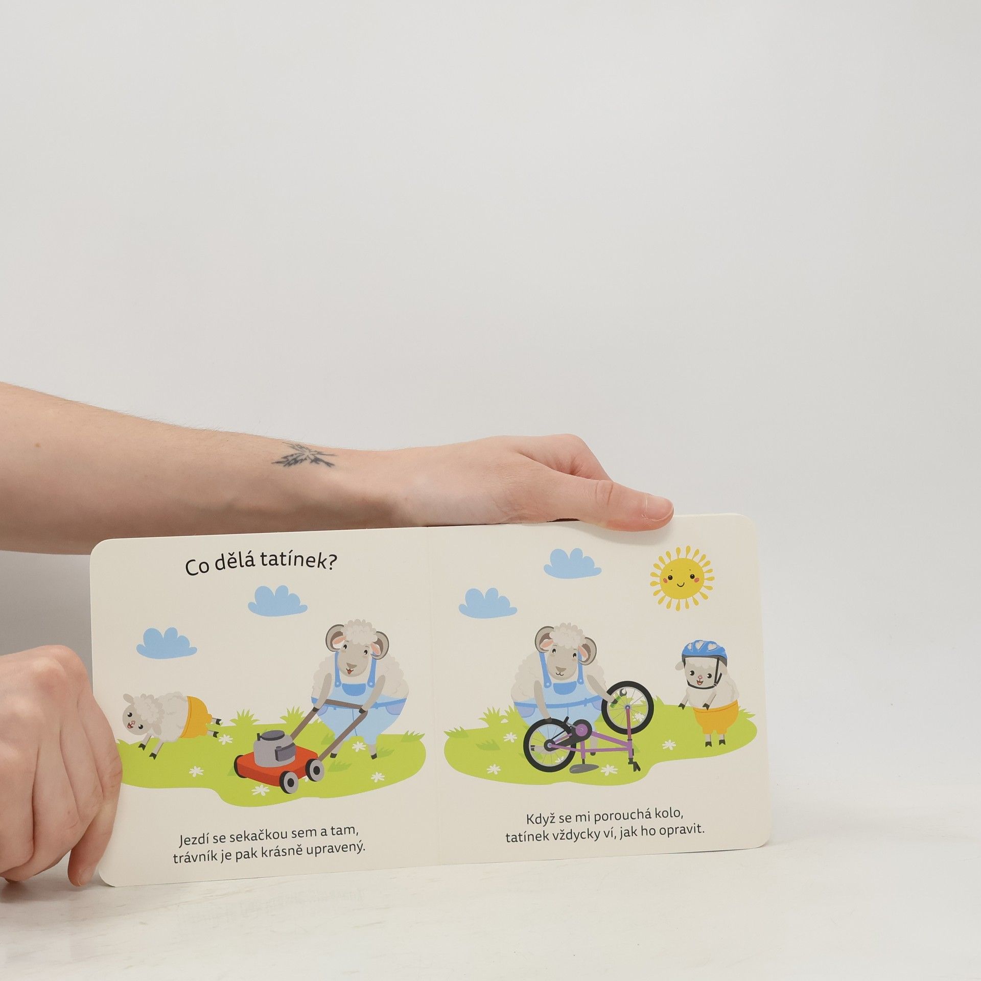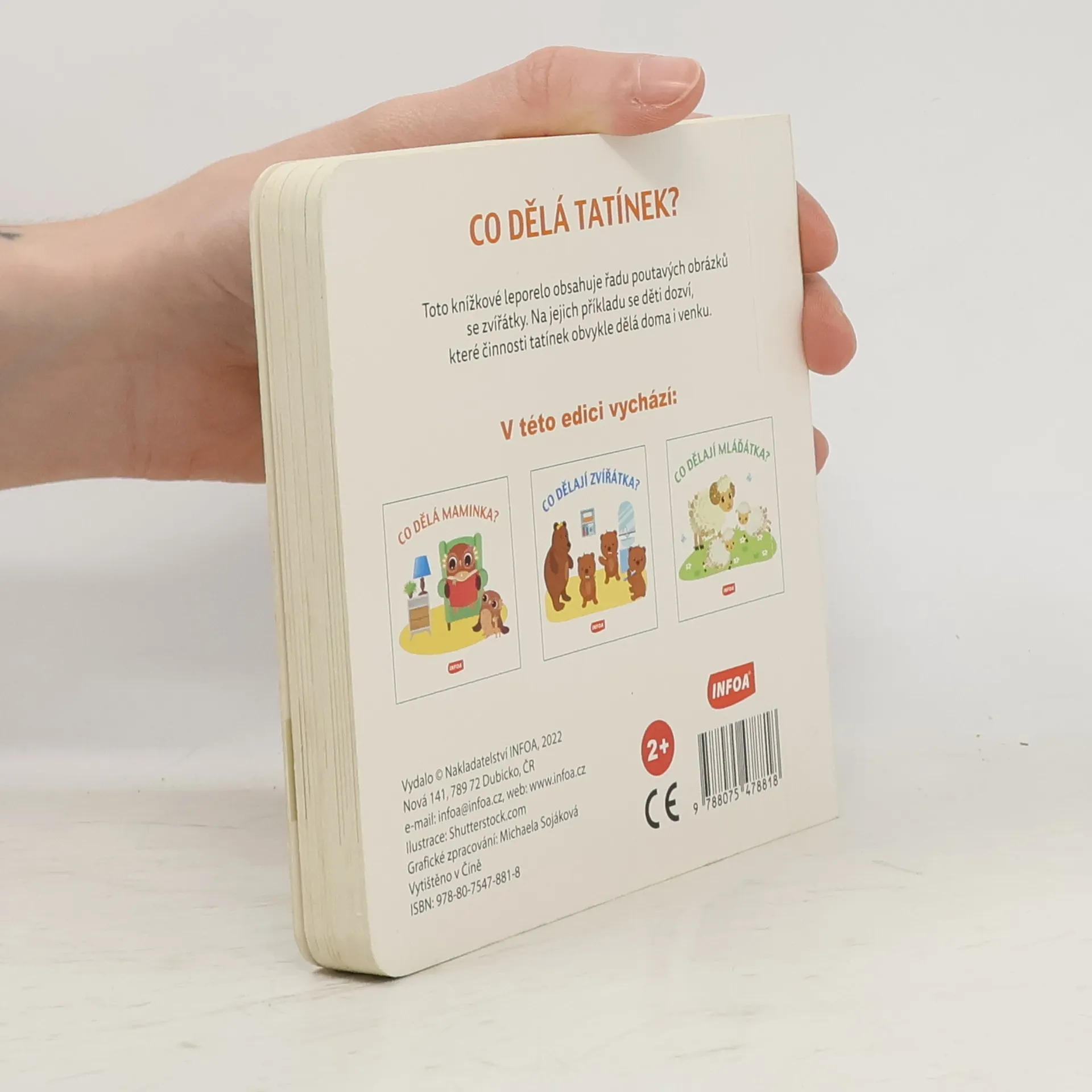 Toto knížkové leporelo obsahuje řadu poutavých obrázků se zvířátky. Na jejich příkladu se děti dozví, které činnosti tatínek obvykle dělá doma i venku.