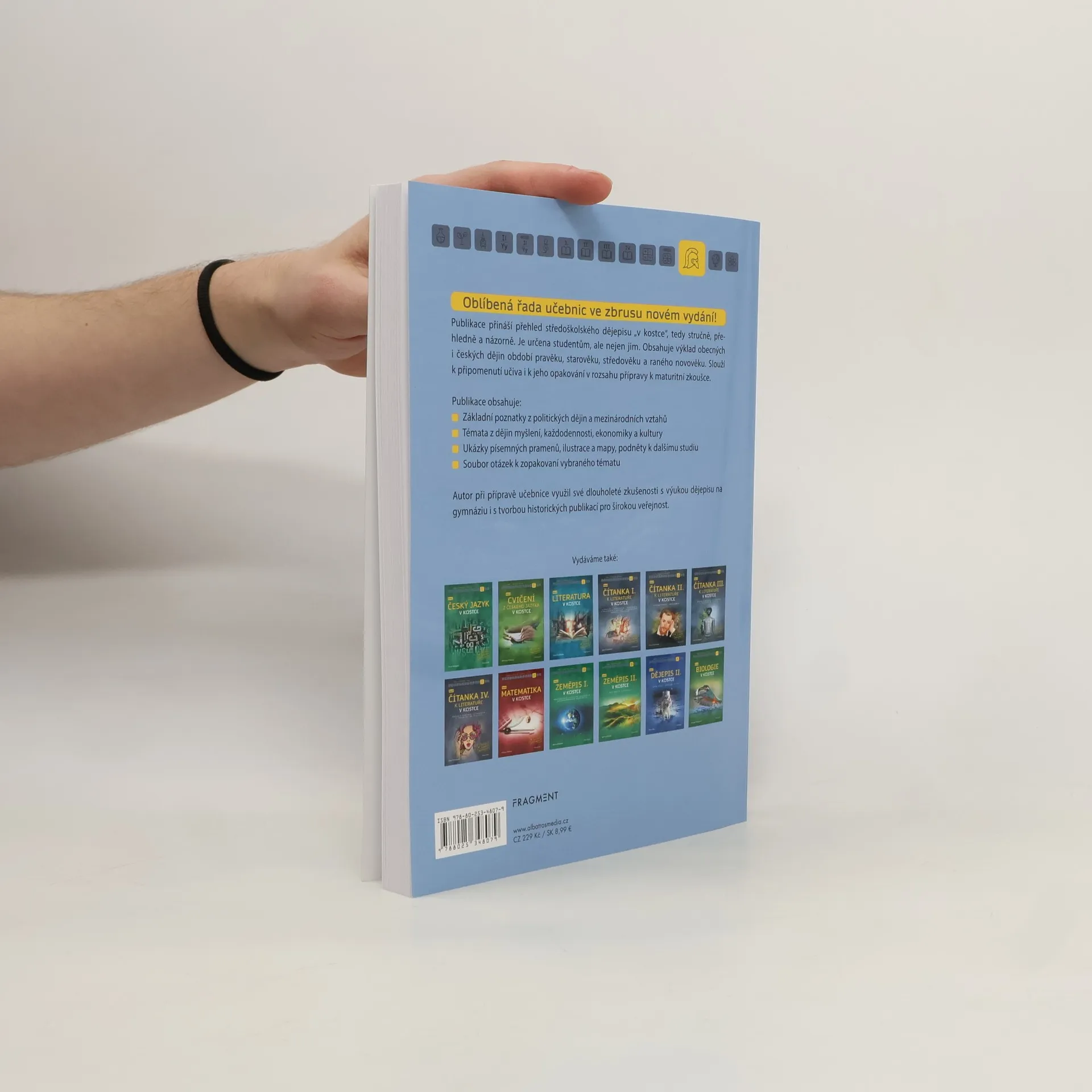 Oblíbená řada učebnic ve zbrusu novém vydání! Publikace přináší přehled středoškolského dějepisu “v kostce”, tedy stručně, přehledně a názorně. Je určena studentům, ale nejen jim. Obsahuje výklad obecných i českých dějin období pravěku, starověku, středověku a novověku. Slouží k připomenutí učiva i k jeho opakování v rozsahu přípravy k maturitní zkoušce. Publikace obsahuje: • Základní poznatky z politických dějin a mezinárodních vztahů • Témata z dějin myšlení, každodennosti, ekonomiky a kultury • Ukázky písemných pramenů, grafy a mapy, podněty k dalšímu studiu • Soubor otázek k zopakovaní vybraného tématu Autor při přípravě učebnice využil své dlouholeté zkušenosti s výukou dějepisu na gymnáziu i s tvorbou historických publikací pro širokou veřejnost.