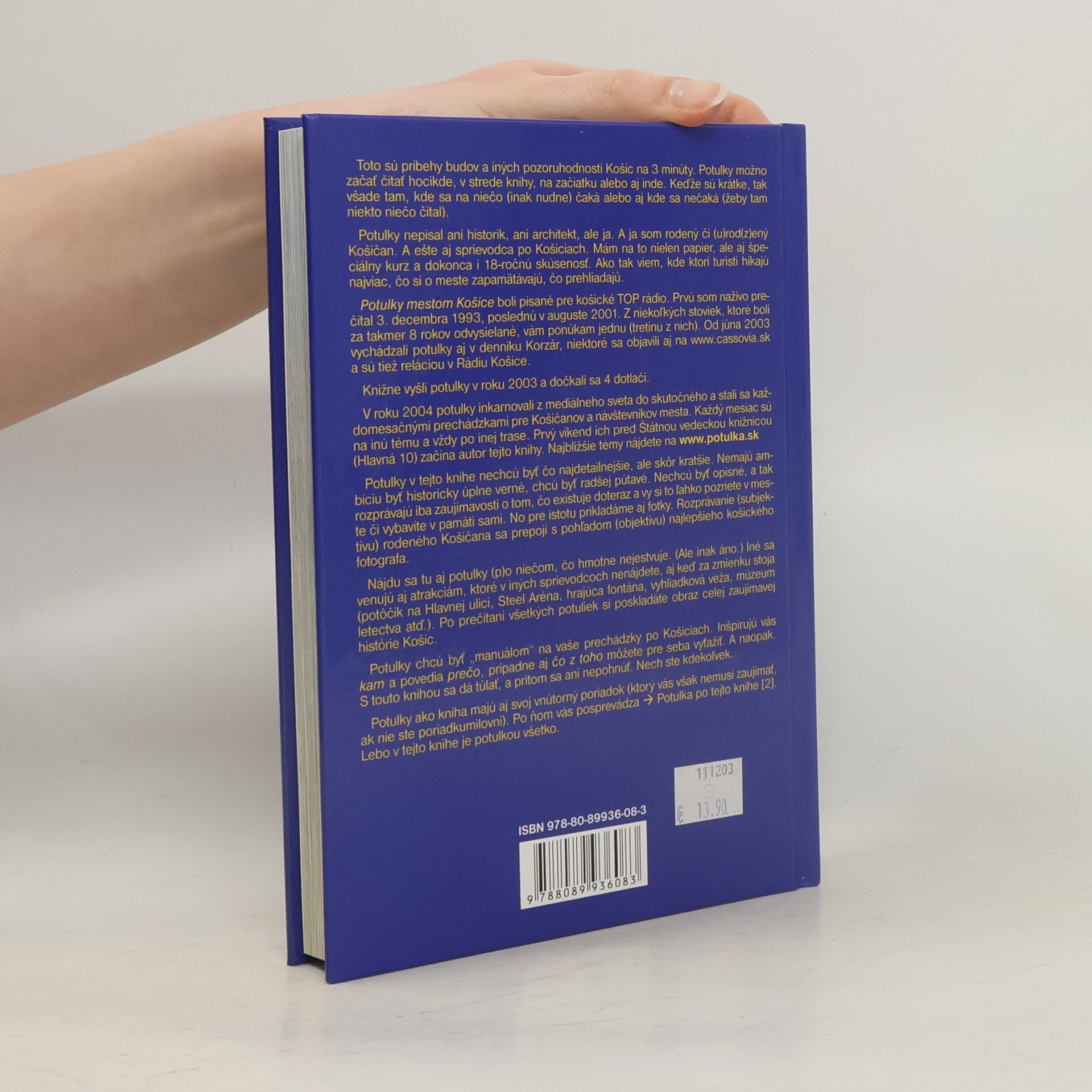 Potulky v tejto knihe nechcú byť čo najdetailnejšie, ale skôr kratšie. Nemajú ambíciu byť historicky úplne verné, chcú byť radšej pútavé. Nechcú byť opisné, a tak rozprávajú iba zaujímavosti o tom, čo existuje doteraz a Vy si to ľahko pozriete v mest e či vybavíte v pamäti sami. No pre istotu prikladáme aj fotky. Rozprávanie (subjektívu) rodeného Košičana sa prepojí s pohľadom (objektívu) najlepšieho košického fotografa.obrazovo - textová publikácia – sprievodca mestom134 potuliek – krátkych príbehov o pamätihodnostiach mesta Košiceviac ako 200 farebných záberovtexty v slovenskom jazyku
