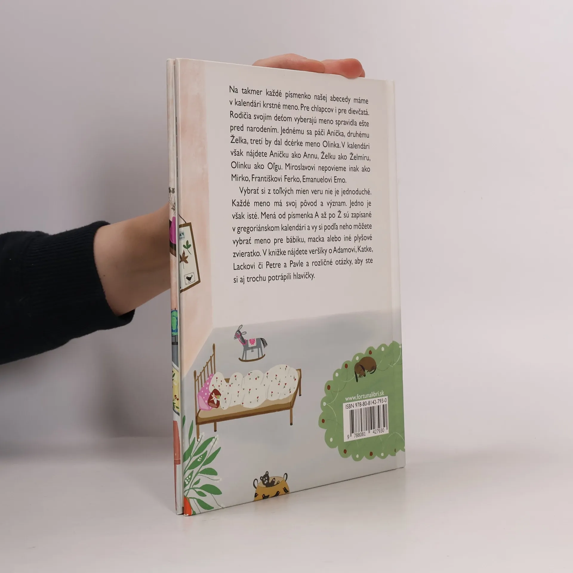 Na takmer každé písmenko našej abecedy máme v kalendári krstné meno. Pre chlapcov i pre dievčatá. Rodičia svojim deťom vyberajú meno spravidla ešte pred narodením. Jednému sa páči Anička, druhému Želka, tretí by dal dcérke meno Olinka. V kalendári však nájdete Aničku ako Annu, Želku ako Želmíru, Olinku ako Oľgu. Miroslavovi nepovieme inak ako Mirko, Františkovi Ferko, Emanuelovi Emo. Vybrať si z toľkých mien veru nie je jednoduché. Každé meno má svoj pôvod a význam. Jedno je však isté. Mená od písmenka A až po Ž sú zapísané v gregoriánskom kalendári a vy si podľa neho môžete vybrať meno pre bábiku, macka alebo iné plyšové zvieratko. V knižke nájdete veršíky o Adamovi, Katke, Lackovi či Petre a Pavle a rozličné otázky, aby ste si trochu aj potrápili hlavičky.