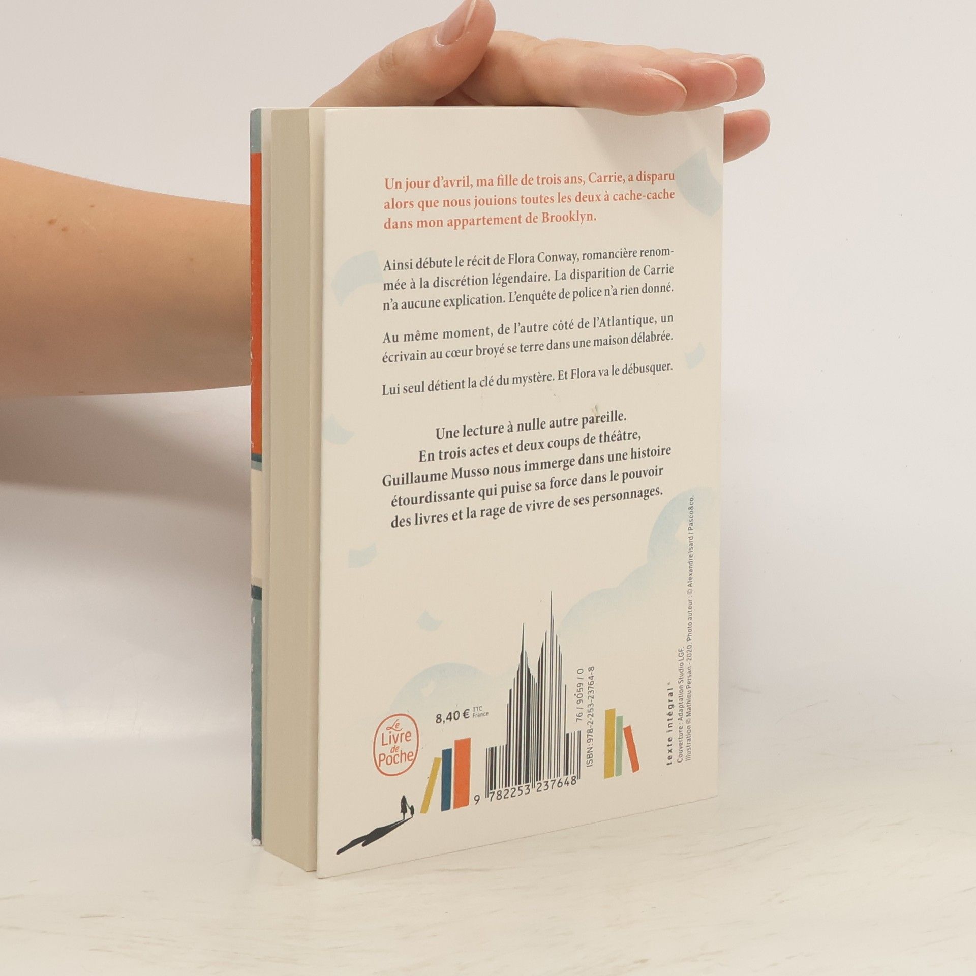 « "Un jour d'avril, ma fille de trois ans, Carrie, a disparu alors que nous jouions toutes les deux à cache-cache dans mon appartement de Brooklyn". Ainsi débute le récit de Flora Conway, romancière renommée à la discrétion légendaire. La disparition de Carrie n'a aucune explication. L'enquête de police n'a rien donné. Au même moment, de l'autre côté de l'Atlantique, un écrivain au cœur broyé se terre dans une maison délabrée. Lui seul détient la clé du mystère. Et Flora va le débusquer. Une lecture à nulle autre pareille. En trois actes et deux coups de théâtre, Guillaume Musso nous immerge dans une histoire étourdissante qui puise sa force dans le pouvoir des livres et la rage de vivre de ses personnages. »