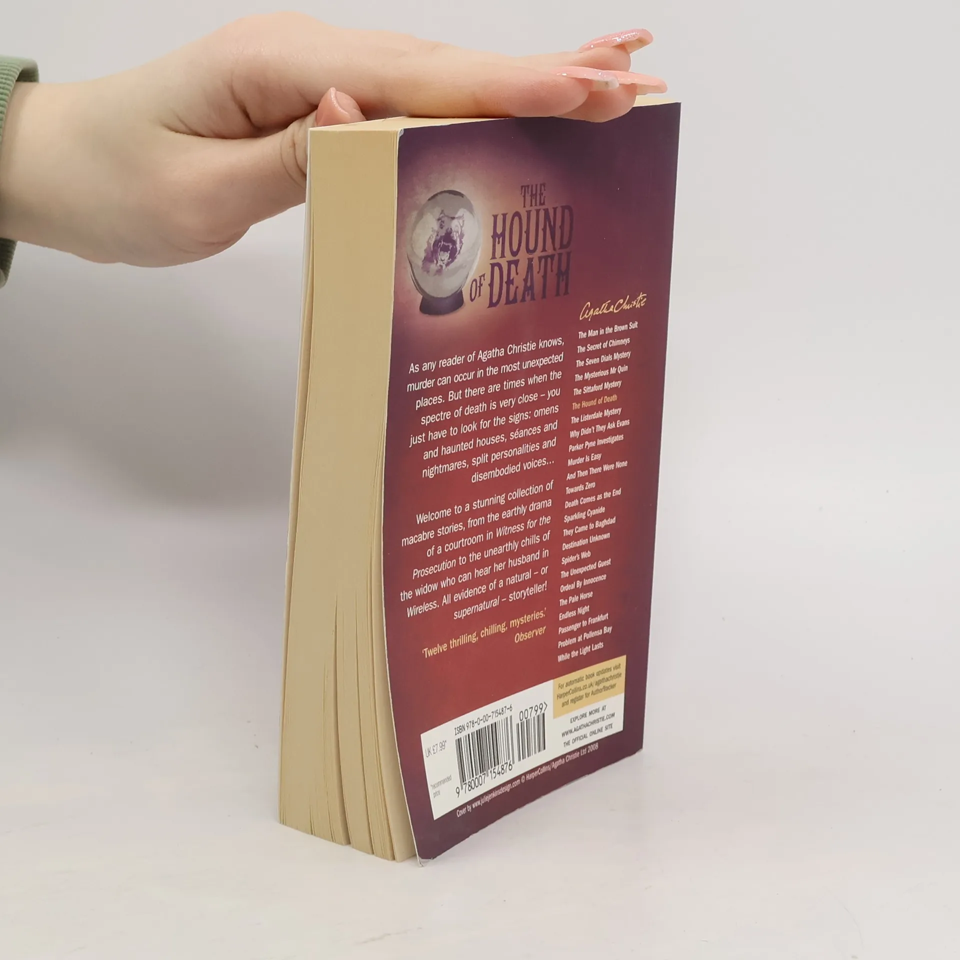Twelve unexplained phenomena with no apparent earthly explanation, including a dog-shaped gunpowder mark; an omen from the "other side"; a haunted house; a chilling seance; an elderly lady's hold over a young man; and a mysterious SOS.ContentsS.O.S. • (1926) • short story by Agatha ChristieThe Call of Wings • (1933) • short story by Agatha ChristieThe Fourth Man • (1933) • short story by Agatha ChristieThe Gipsy • (1933) • short story by Agatha ChristieThe Hound of Death • (1933) • short story by Agatha ChristieThe Lamp • (1933) • short story by Agatha ChristieThe Last Séance • (1926) • short story by Agatha ChristieThe Mystery of the Blue Jar • (1924) • short story by Agatha ChristieThe Red Signal • (1924) • short story by Agatha ChristieThe Strange Case of Sir Arthur Carmichael • (1933) • short story by Agatha ChristieThe Witness for the Prosecution • non-genre • (1924) • novelette by Agatha ChristieWireless • (1926) • short story by Agatha Christie