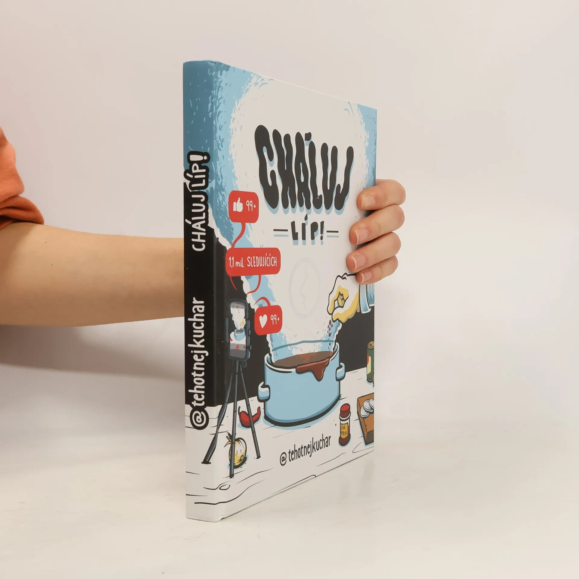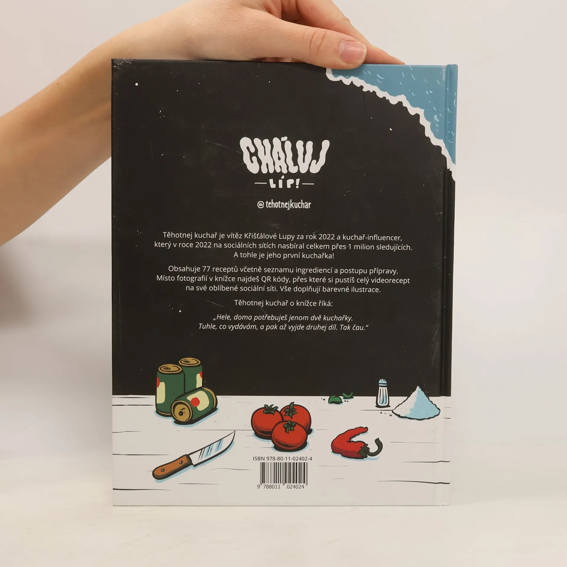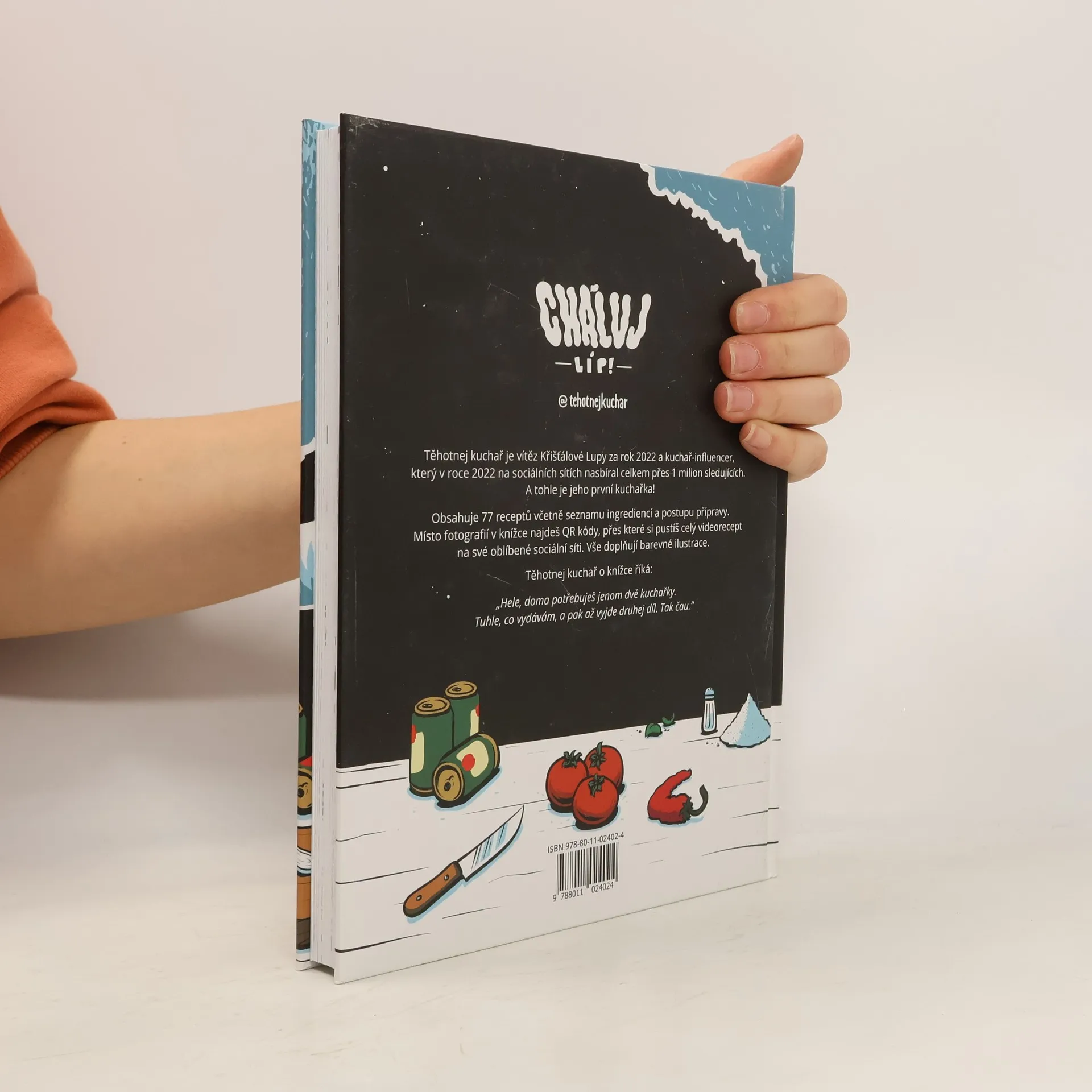 Těhotnej kuchař vydává svou první kuchařku! A je jiná, než jste zvyklí. Obsahuje 77 receptů včetně seznamu ingrediencí a postupu přípravy. Místo fotografií v knížce najdeš QR kódy, přes které si pustíš celý videorecept na své oblíbené sociální síti. Vše pak doplňují barevné ilustrace. "Hele, doma potřebujes jenom dvě kuchařky. Tuhle, co vydávám a pak až vyjde druhej díl. Tak čau."