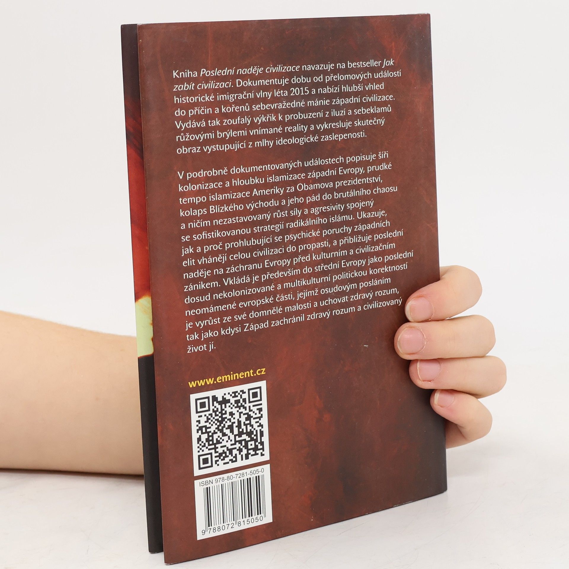 Kniha Poslední naděje civilizace navazuje na bestseller Jak zabit civilizaci. Dokumentuje dobu od přelomových událostí historické imigrační vlny léta 2015 a nabízí hlubší vhled do příčin a kořenů sebevražedné mánie západní civilizace. Vydává tak zoufalý výkřik k probuzeni z iluzí a sebeklamů růžovými brýlemi vnímané reality a vykresluje skutečný obraz vystupující z mlhy ideologické zaslepenosti. V podrobně dokumentovaných událostech popisuje šíři kolonizace a hloubku islamizace západní Evropy, prudké tempo islamizace Ameriky za Obamova prezidentství, kolaps Blízkého východu a jeho pád do brutálního chaosu a ničím nezastavovaný růst síly a agresivity spojený se sofistikovanou strategií radikálního islámu. Ukazuje, jak a proč prohlubující se psychické poruchy západních elit vhánějí celou civilizaci do propasti, a přibližuje poslední naděje na záchranu Evropy před kulturním a civilizačním zánikem. Vkládá je především do střední Evropy jako poslední dosud nekolonizované a multikulturní politickou korektností neomámené evropské části, jejímž osudovým posláním je vyrůst ze své domnělé malosti a uchovat zdravý rozum, tak jako kdysi Západ zachránil zdravý rozum a civilizovaný život jí.