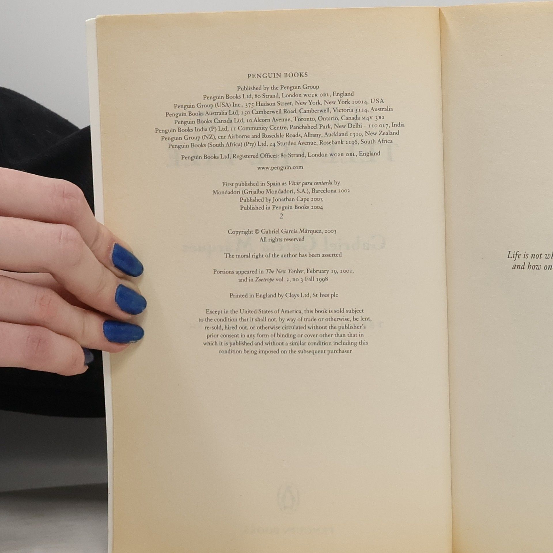 This work, the first volume of a planned trilogy, is the memoir of Nobel Laureate Gabriel García Márquez. It contains details of people, places, events, family, work, politics, books and music, his beloved Colombia and parts of history and incidents that later appeared in his fiction.