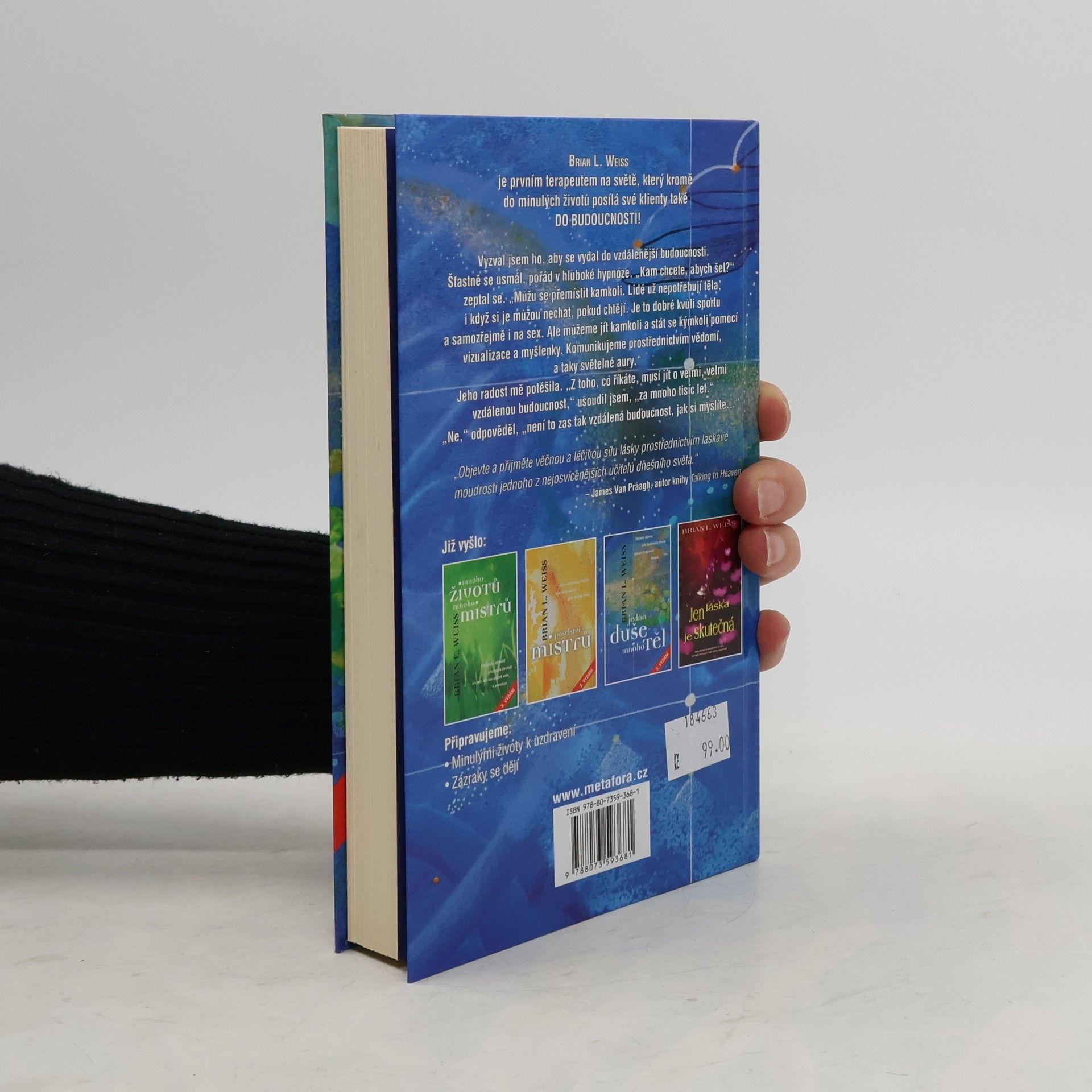 Brian L. Weiss je prvním terapeutem na světě, který kromě do minulých životů posílá své klienty také DO BUDOUCNOSTI! Vyzval jsem ho, aby se vydal do vzdálenější budoucnosti. Šťastně se usmál, pořád v hluboké hypnóze. "Kam chcete, abych šel?" zeptal se. "Můžu se přemístit kamkoli. Lidé už nepotřebují těla, i když si je můžou nechat, pokud chtějí. Je to dobré kvůli sportu a samozřejmě i na sex. Ale můžeme jít kamkoliv a stát se kýmkoli pomocí vizualizace a myšlenky. Komunikujeme prostřednictvím vědomí, a taky světelné aury." Jeho radost mě potěšila. "Z toho, co říkáte, musí jít o velmi vzdálenou budoucnost," usoudil jsem, "za mnoho tisíc let." "Ne," odpověděl, "není to zas tak vzdálená budoucnost, jak si myslíte..." 3. vydání.