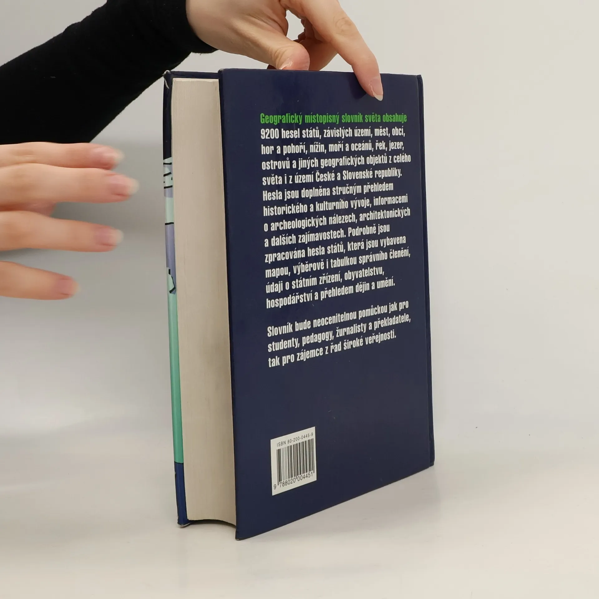 Slovník obsahuje 9200 hesel států, závislých území, měst, obcí, hor a pohoří, nížin, moří a oceánů, řek, jezer ostrovů a jiných geografických objektů z celého světa i z území České a Slovenské republiky. Hesla jsou doplněna stručným přehledem historického a kulturního vývoje, informacemi o archeologických nálezech, architektonických a dalších zajímavostech. Podrobně jsou zpracována hesla států (mapa, hospodářské a historické údaje, atd.). Slovník bude neocenitelnou pomůckou jak pro studenty, pedagogy, žurnalisty a překladatele, tak pro zájemce z řad široké veřejnosti. První vydání. V roce 1999 vyšel dotisk pod stejným ISBN.