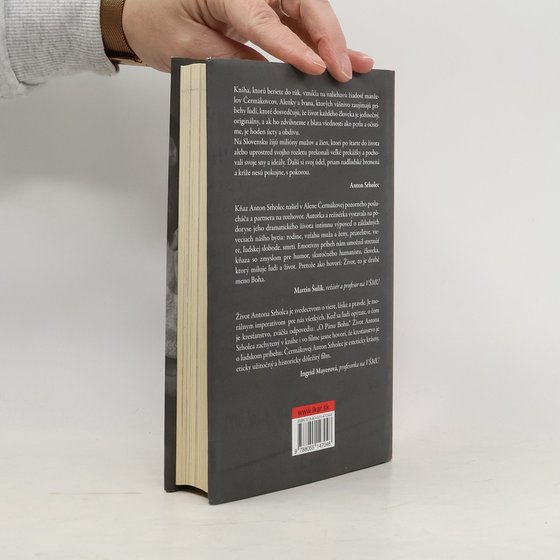 Silný životný príbeh Antona Srholca, rímskokatolíckeho kňaza, saleziána, spisovateľa, charitatívneho pracovníka, politického väzňa a buriča, ale predovšetkým láskavého človeka, ktorý nikdy neopustil svoje zásady a vždy bojoval za lepší svet, zachytila v celovečernom dokumentárnom filme režisérka Alena Čermáková. Rozhovory s Antonom Srholcom spočiatku viedla u seba doma pri raňajkách. Neskôr vznikla potreba zaznamenať ich a začal sa rodiť podklad pre knihu, v ktorej sa autorka snažila zachovať autenticitu Srholcových slov, aby priblížila ľuďom jeho zmýšľanie o svete i o Bohu čo najpravdivejšie, najvernejšie. Rozhovory a úvahy predstavujú čitateľom minulé i súčasné dni tohto výnimočného muža. Umožňujú im nahliadnuť do spôsobu jeho premýšľania a činov, odhalia jeho húževnatosť, túžbu pomáhať a milovať ľudí až na smrť. Autorka neprináša len Srholcov portrét, ale predovšetkým vyjadruje úctu mužovi, ktorý nám ukazuje smer na ceste životom. Knihu dopĺňajú fotografie zo súkromného archívu Antona Srholca a jeho najbližších, ale aj dokumenty z leopoldovskej väznice a umelecké fotografie Maňa Štraucha.