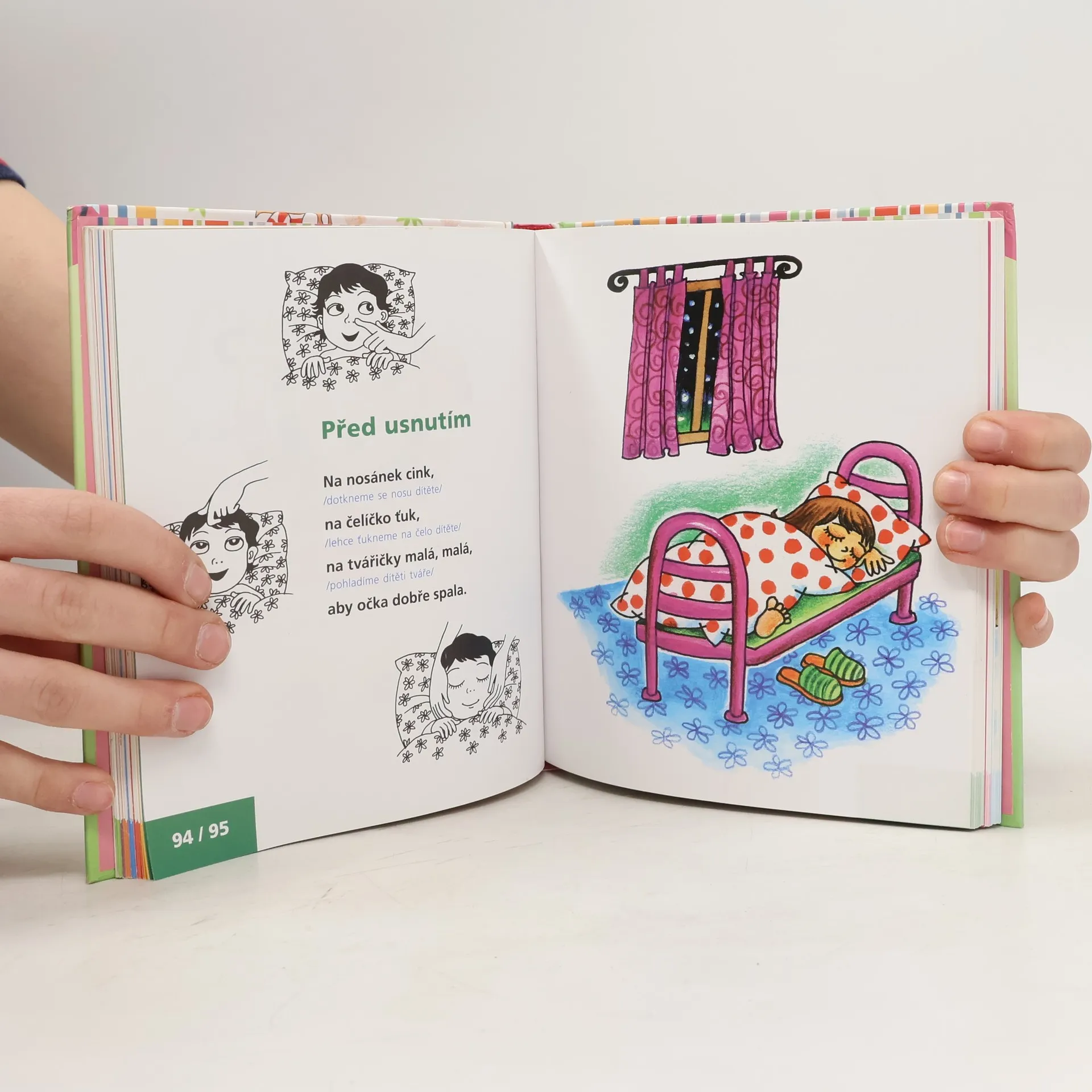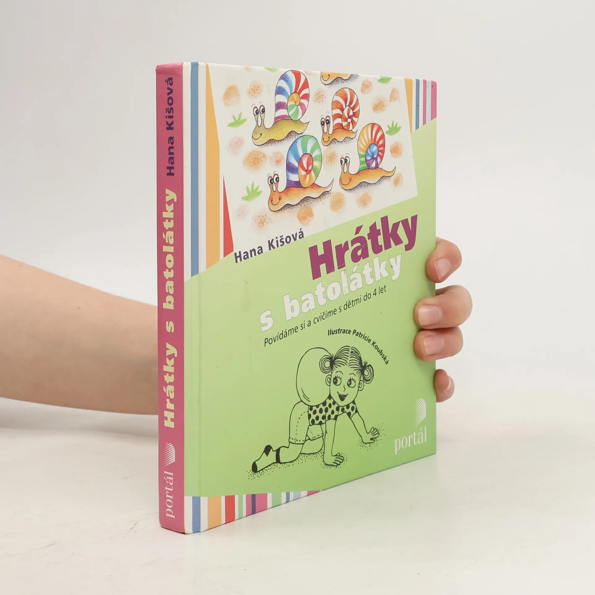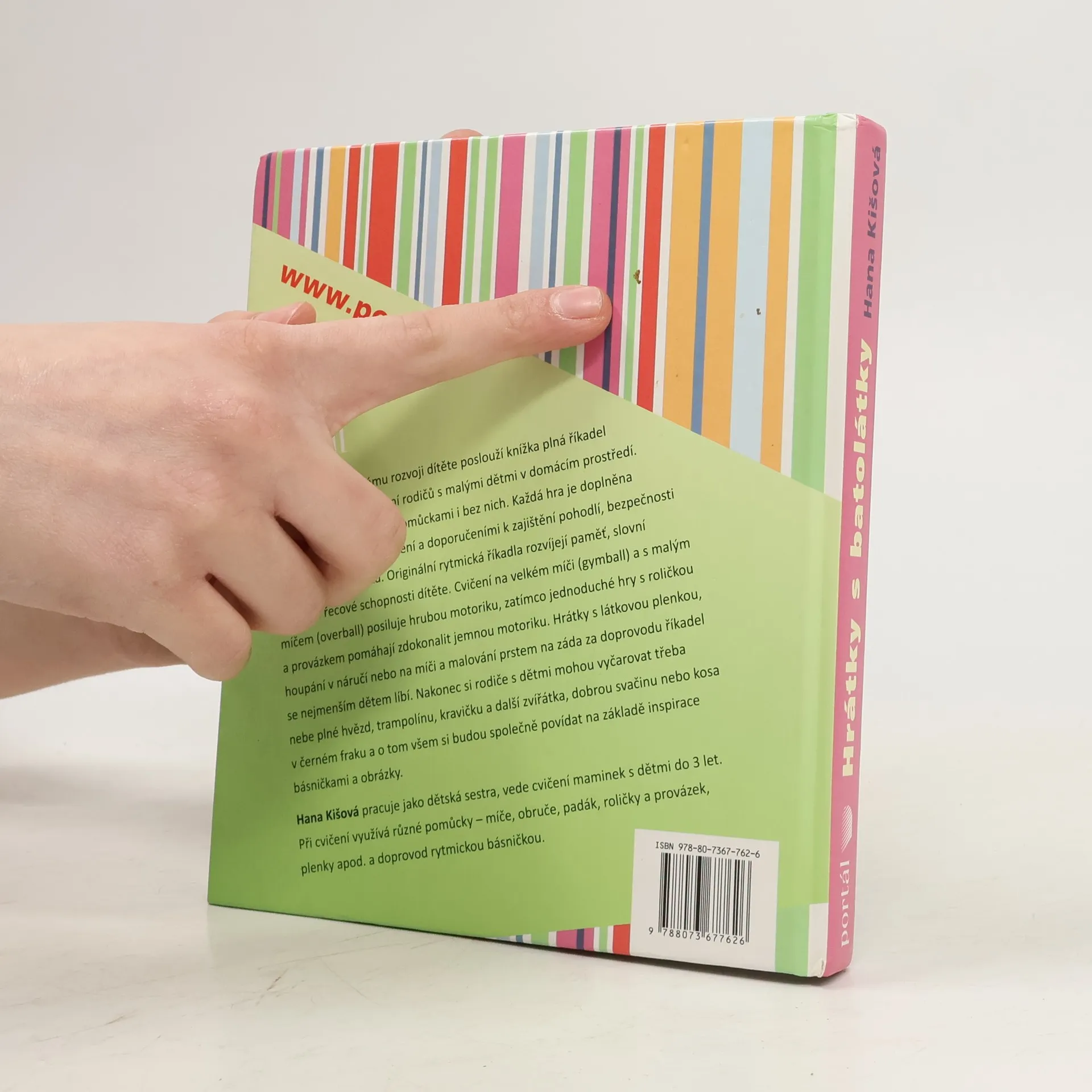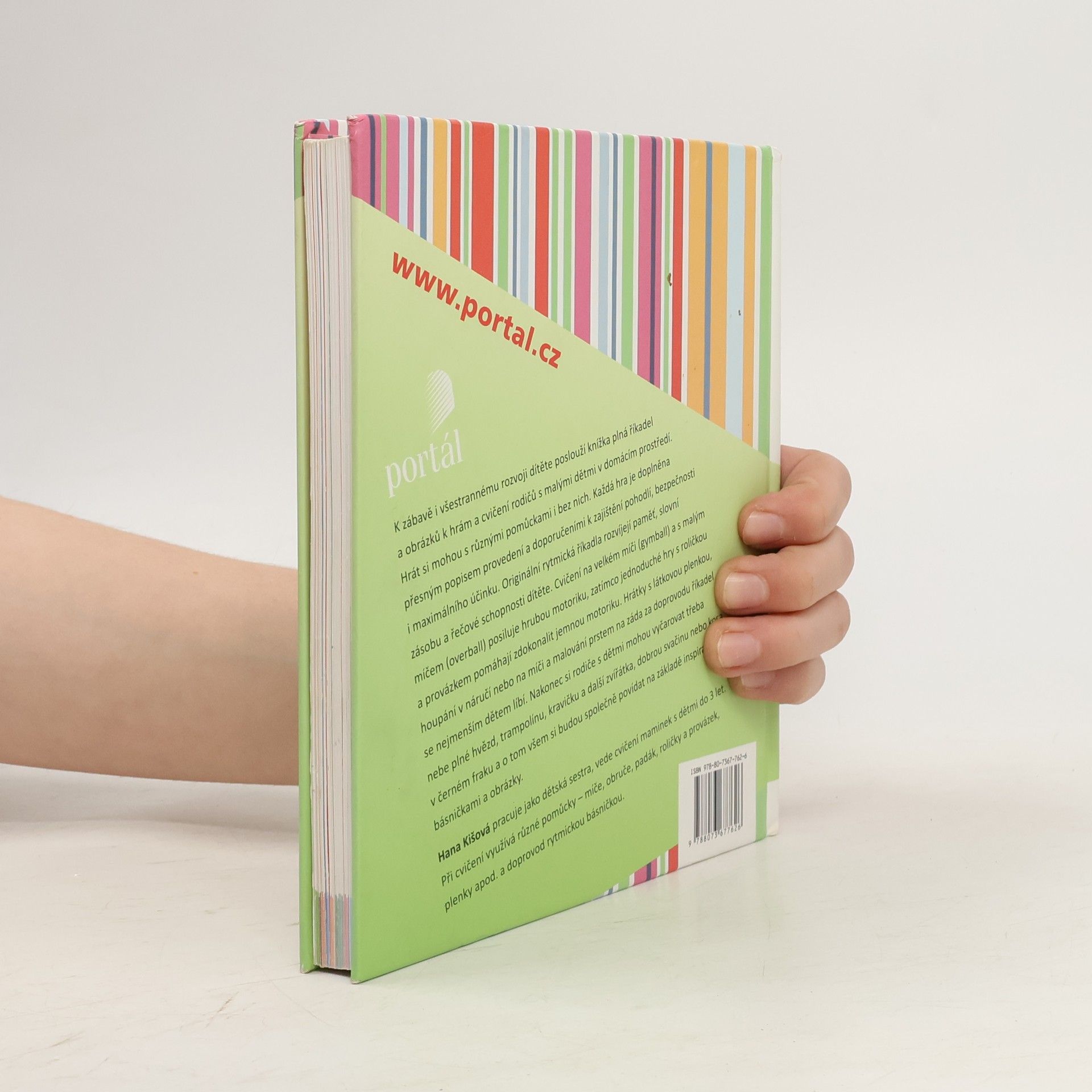Podtitul: Povídáme si a cvičíme s dětmi do 4 let K zábavě i všestrannému rozvoji dítěte poslouží knížka plná říkadel a obrázků k hrám a cvičení rodičů s malými dětmi v domácím prostředí. Hrát si budou s různými pomůckami i bez nich. Každá hra je doplněna přesným popisem provedení a doporučeními k zajištění pohodlí, bezpečnosti i maximálního účinku. Originální rytmická říkadla rozvíjejí paměť, slovní zásobu a řečové schopnosti dítěte. Cvičení na velkém míči (gymball) a s malým míčem (overball) posiluje hrubou motoriku, zatímco jednoduché hry s roličkou a provázkem pomáhají zdokonalit jemnou motoriku. Hrátky s látkovou plenkou, houpání v náručí nebo na míči a malování prstem na záda za doprovodu říkadel se nejmenším dětem líbí. Nakonec si rodiče s dětmi mohou vyčarovat třeba nebe plné hvězd, trampolínu, kravičku a další zvířátka, dobrou svačinu nebo kosa v černém fraku a o tom všem si budou společně povídat na základě inspirace básničkami a obrázky. Hana Kišová pracuje jako dětská sestra, vede cvičení maminek s dětmi do 3 let. Při cvičení využívá různé pomůcky – míče, obruče, padák, roličky a provázek, plenky apod. a doprovod rytmickou básničkou.