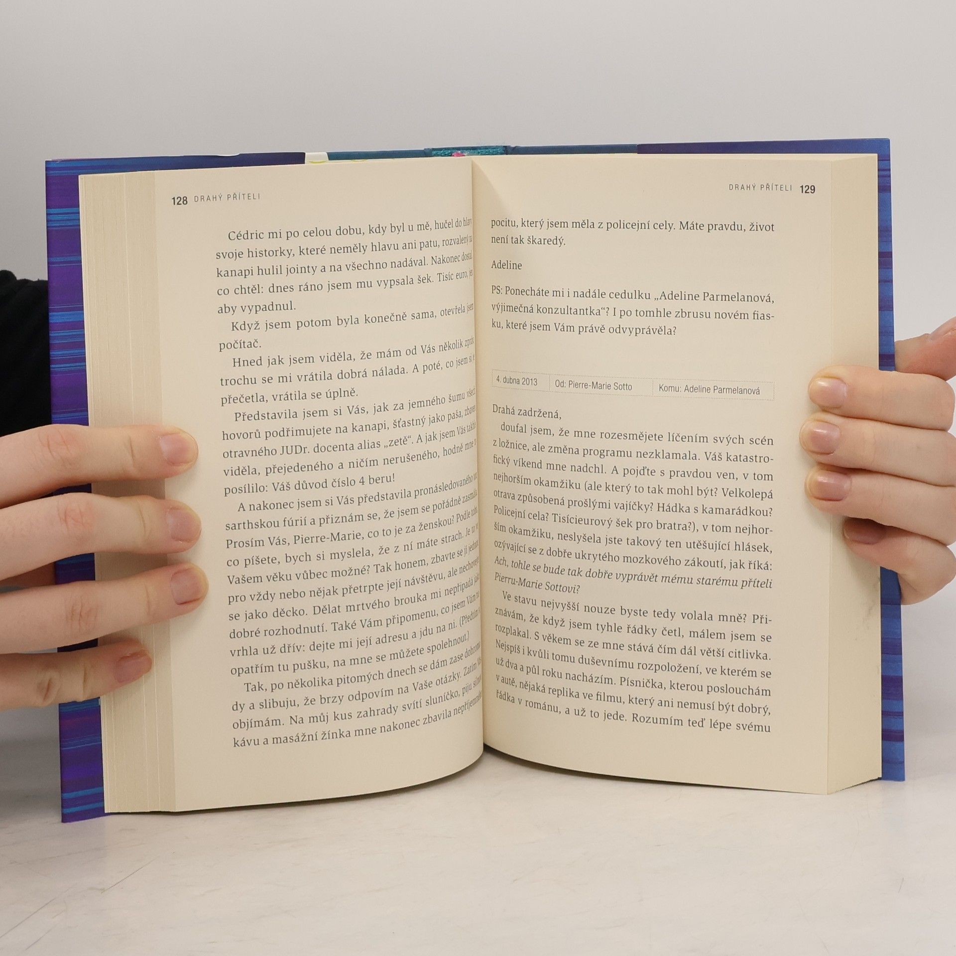 Pierre-Marie Sotto je slavný, u čtenářů úspěšný a kritikou oceňovaný spisovatel. Je to ale také stárnoucí, osamělý muž, a pokud jde o jeho práci – momentálně je v hluboké tvůrčí krizi. Jednoho dne k němu dorazí objemná obálka bez zpáteční adresy; jediný kontakt na ní uvedený je e-mailová adresa jisté Adeline Parmelanové. Sotto nepochybuje, že mu nějaká „nadějná spisovatelka“ posílá k posouzení svůj rukopis. Obálku neotevře, odesílatelku zdvořile odmítne a požádá ji o adresu, kam by mohl zásilku vrátit. Než mu Adeline vyhoví, vymění si spolu několik e-mailů, které jsou natolik vtipné a zajímavé, že v dopisování pokračují a objemná obálka zůstává (na žádost Adeline) ležet neotevřená na Sottově polici. Jenomže je v tom háček…