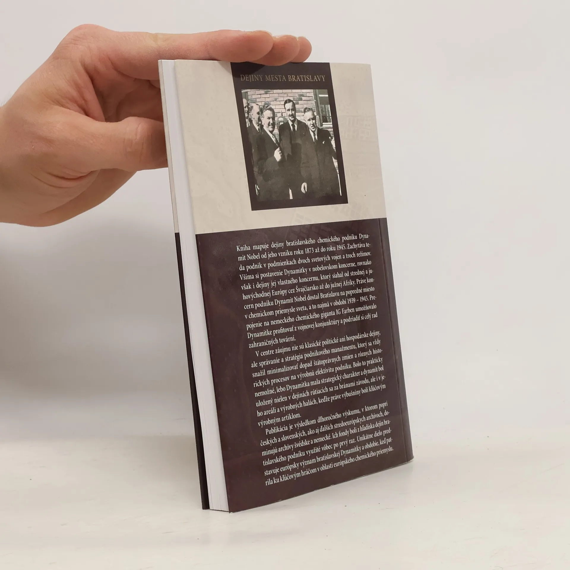 Bratislavský podnik Dynamit Nobel na križovatkách novodobých dejín (1873-1945) Kniha mapuje dejiny bratislavského chemického podniku Dynamit Nobel od jeho vzniku roku 1873 až do roku 1945. Zachytáva teda podnik v podmienkach dvoch svetových vojen a troch režimov. Všíma si postavenie Dynamitky v nobelovskom koncerne, rovnako však i dejiny jej vlastného koncernu, ktorý siahal od strednej a juhovýchodnej Európy cez Švajčiarsko až do južnej Afriky. Práve koncern podniku Dynamit Nobel dostal Bratislavu na popredné miesto v chemickom priemysle sveta, a to najmä v období 1939-1945. Prepojenie na nemeckého chemického giganta IG Farben umožňovalo Dynamitke profitovať z vojnovej konjunktúry a podriadiť si celý rad zahraničných tovární. V centre záujmu nie sú klasické politické ani hospodárske dejiny, ale správanie sa a stratégia podnikového manažmentu, ktorý sa vždy snažil minimalizovať dopad štátoprávnych zmien a rôznych historických procesov na výrobnú efektivitu podniku. Bolo to prakticky nemožné, lebo Dynamitka mala strategický charakter a dynamit bol uložený nielen v dejinách rútiacich sa za bránami závodu, ale i v jeho areáli a výrobných halách, keďže práve výbušniny boli kľúčovým výrobným artiklom.
