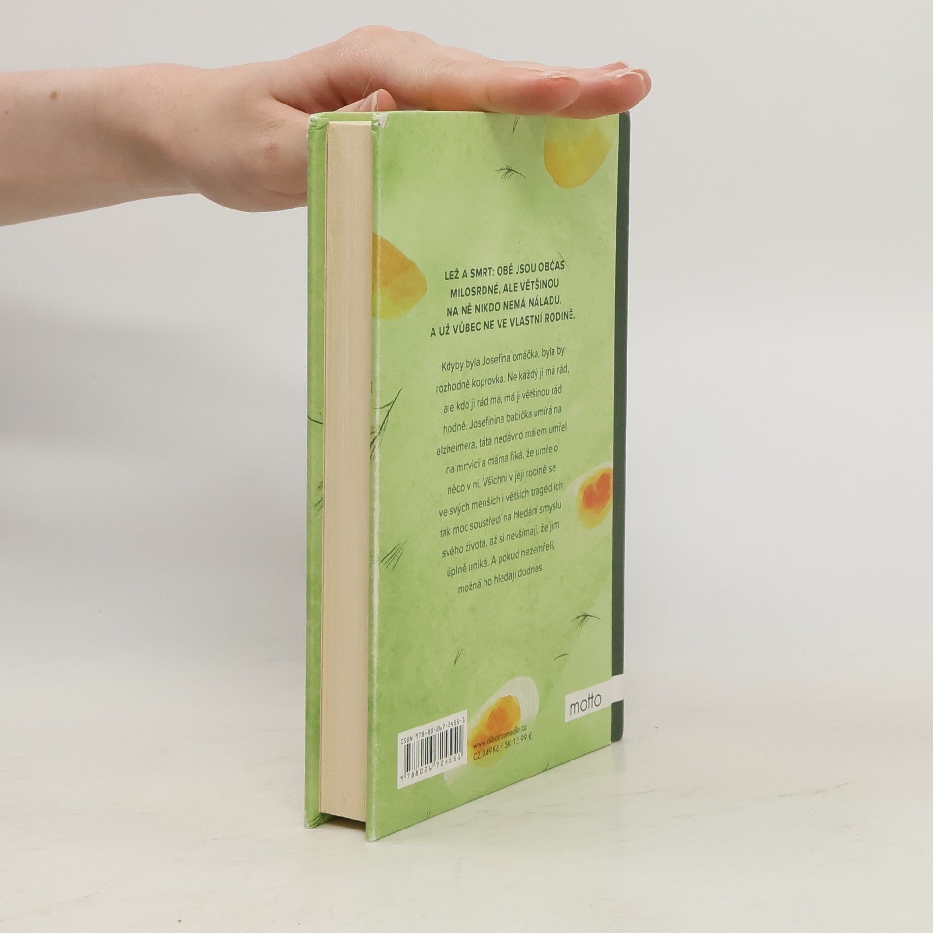 Kdyby byla Josefína omáčka, byla by rozhodně koprovka. Ne každý ji má rád, ale kdo ji rád má, má ji většinou rád hodně. Babička jí umírá na Alzheimera, táta nedávno málem umřel na mrtvici a máma říká, že umřelo něco v ní. Všichni v Josefínině rodině se ve svých menších i větších tragédiích tak moc soustředí na hledání smyslu svého života, až si nevšímají, že jim úplně uniká. A pokud nezemřeli, možná ho hledají dodnes.